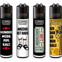 CLIPPER Зажигалки 4 Stück im Set mit Spruch nachfüllbar & wiederverwendbar (4-St), Original Зажигалки im Set mit Spruch "hunger,müde,pipi,kalt"