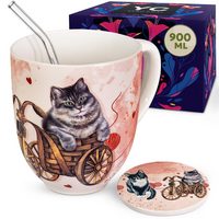 Yang Chai Tasse 900ml - große Teetasse - XXL Tasse Geschenkset mit Untersetzer, Knochen Porzellan, Katzentasse, Jumbo Tasse, Geschenk für Katzenliebhaber