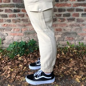 Klassisch kam die Cargohose früher in olivgrün, doch heute sind die Modelle auch mal beige, weiß, schwarz oder aus Denim. Die Hose ist häufig auf High-Waist geschnitten und schließt – schmal zulaufend – unten mit einem Bündchen ab.