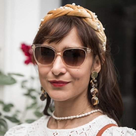 Die Perlen vom Haarreif finden sich sowohl am Armband als auch an der Kette wieder. Im Kettenlayering wurde zusätzlich ein Choker mit kleinen Sternchen umgelegt. Die langen Ohrringe in Hornoptik greifen die Farben des Rocks auf, und das transparente Gestell der Brille ergänzt den Look.