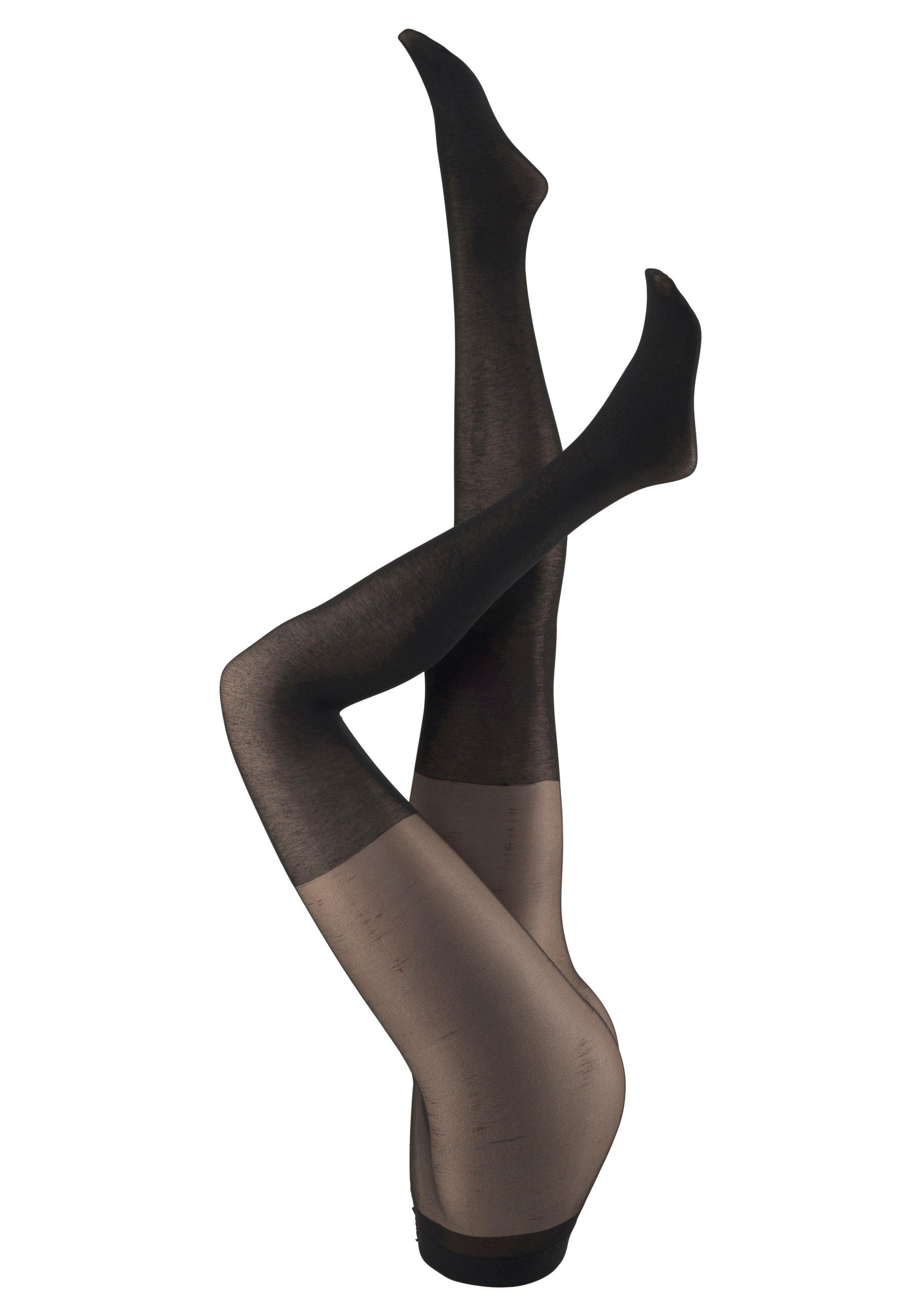 Der Strumpf an sich soll sichtbar sein, deshalb greife zu einem kurzen Rock. Am besten eignet sich ein Modell – hier aus Lederimitat –, das knapp über den Socken endet, sodass nur ein schmaler Streifen Haut sichtbar wird. Im Herbst kannst du unter den Socken zusätzlich eine feine Strumpfhose tragen. Tipp: Es gibt auch Strumpfhosen, die den Effekt der langen Socken imitieren.