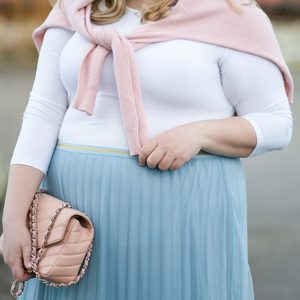 Wer kein weiteres Volumen in den Hüft- und Schenkelbereich bringen möchte, könnte einen Plisseerock mit schwach ausgeprägten Falten kombinieren, z.B. aus einem dünnen Tüll, Mesh oder anderem transparenten Stoff.