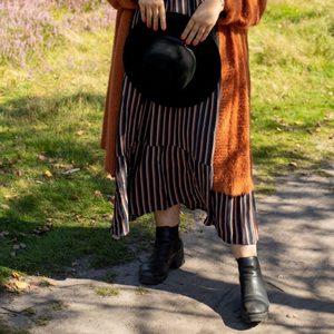 Gegen die kühlere Luft hilft eine Strumpfhose unter deinem Sommerkleid. An goldenen Herbsttagen, die noch richtig warm werden können, kannst du sie dafür weglassen. Strickjacke und Stiefel wärmen und machen einen spannenden Look daraus.