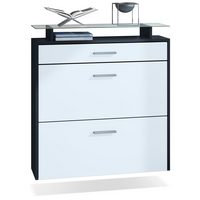 Vladon Schuhschrank Malea (hängender Schuhkipper für 16 Paar Schuhe, mit 2 Klappen und 1 Schublade und Glasablage) Weiß matt (89 x 96 x 23 cm)