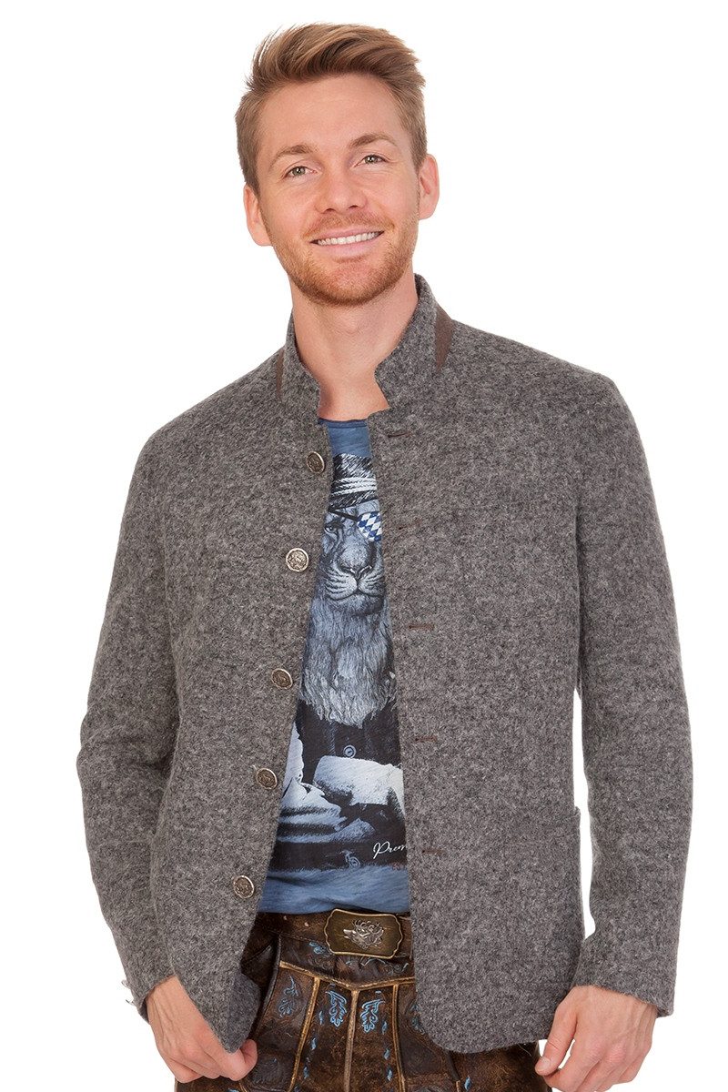 Ellmau, der herrliche, grob gewalkte Trachtenjanker für Herren mit kuscheliger Optik sowie Haptik von der Marke 1890 Country by Murk, ist ein optimaler Wiesn-Begleiter an kühlen Tagen. Die sportive, leicht taillierte Herrenjacke hat einen eleganten Stehkragen mit Walk-Besatz in Kontrastfarbe und besitzt exklusive, altsilberne Metallknöpfe, die mit einem zünftigen Motiv eines röhrenden Hirschs veredelt sind. Die Knopflöcher sind mit Garn im leichten Farbkontrast umnäht. Vorn gibt es zwei aufgesetzte Seitentaschen sowie eine aufgesetzte Brusttasche links. Die Ärmelenden sind mit Zierknöpfen bestückt. Rückseitig ist der Janker im amerikanischen Stil unten mittig geschlitzt. Das karierte Innenfutter mit alpinen Motiven im Nackenbereich läuft schräg nach vorn zur Knopfleiste. Zudem gibt es links und rechts je eine Innentasche, beide sind mit Knopfverschluss versehen. Diese fantastische Kreation mit Schurwoll-Anteil lässt sich wunderbar mit Lederhosen und Trachtenjeans kombinieren. Bitte beachten Sie die Übergrößenzuschläge ab Размер 56.