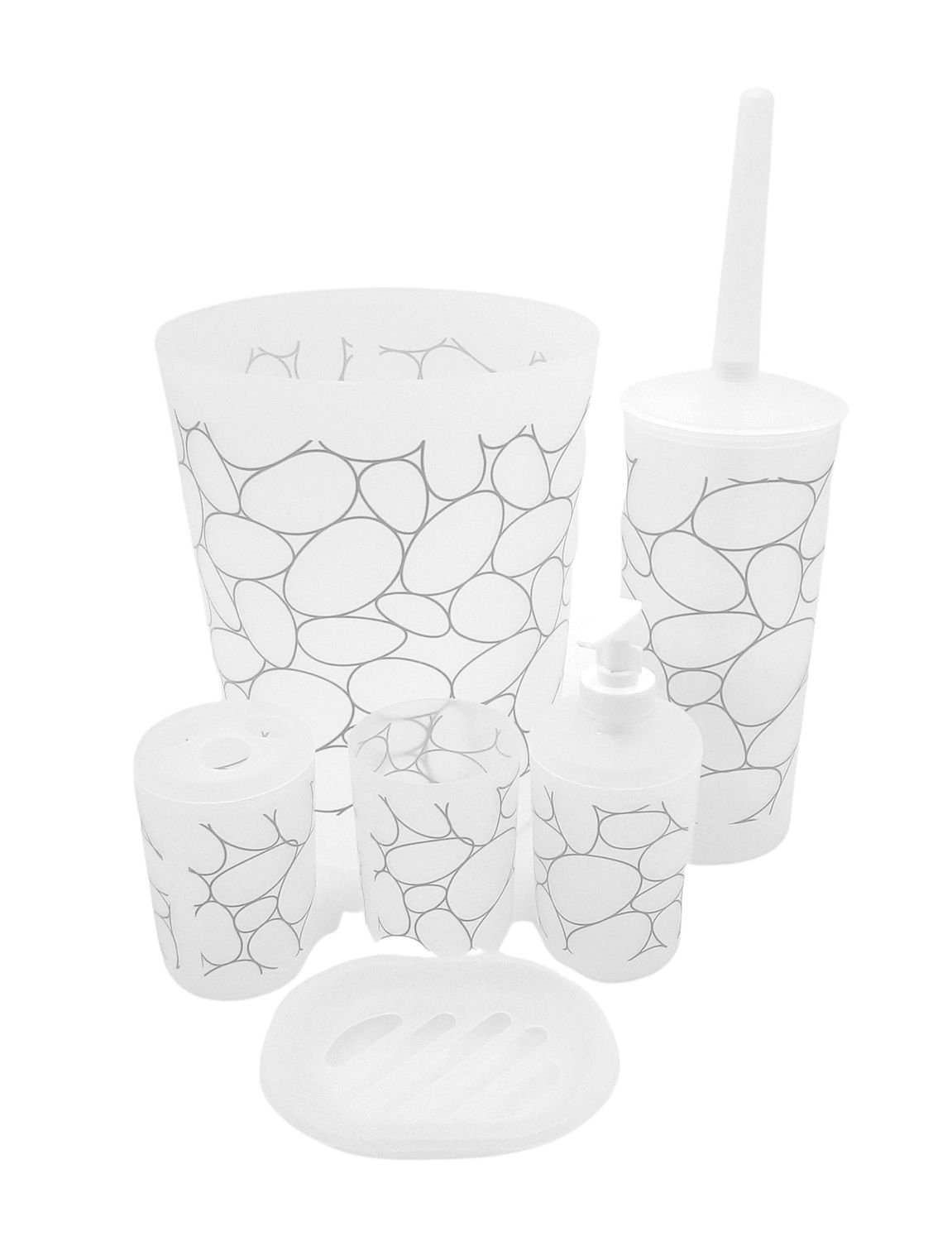 - bestehend aus: 1 Mülleimer, 1 WC-Garnitur, 1 Seifenspender, 1 Zahnputzbecher, 1 Zahnbürstenhalter, 1 Seifenschale