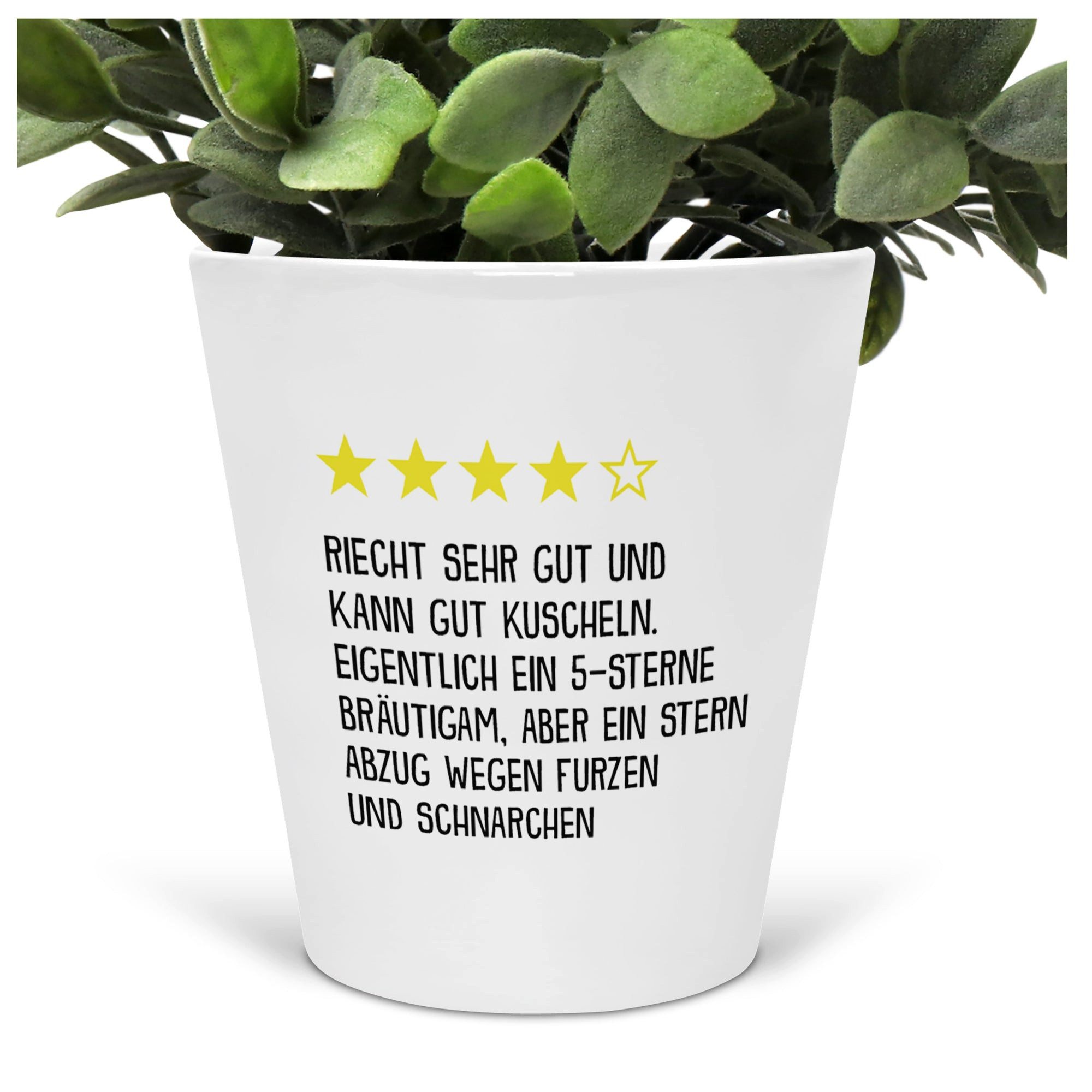 In Deutschland bedruckter weisser Blumentopif mit folgendem Spruch bzw. Motiv: 4 Sterne Bräutigam - Riecht sehr gut und kann gut kuscheln. Eigentlich ein 5-Sterne Bräutigam, aber ein Stern Abzug wegen Furzen und Schnarchen