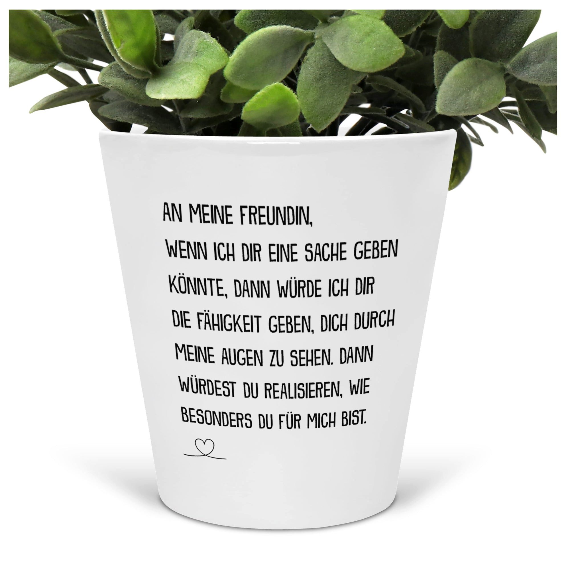 In Deutschland bedruckter weisser Blumentopif mit folgendem Spruch bzw. Motiv: An meine Freundin, Wenn ich dir eine Sache geben könnte, dann würde ich dir die Fähigkeit geben, dich durch meine Augen zu sehen, dann würdest du realisieren, wie besonders du für mich bist
