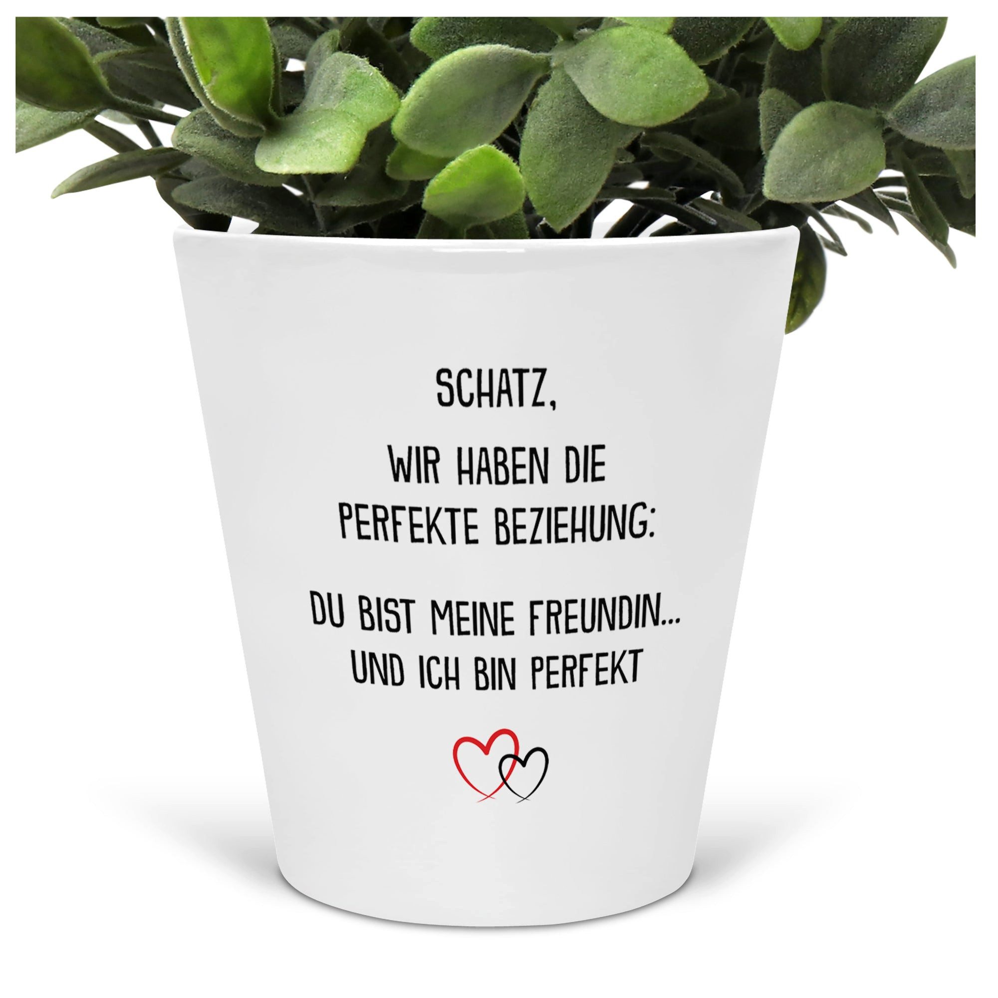 In Deutschland bedruckter weisser Blumentopif mit folgendem Spruch bzw. Motiv: Schatz, Wir haben die perfekte Beziehung: Du bist meine Freundin... und ich bin perfekt