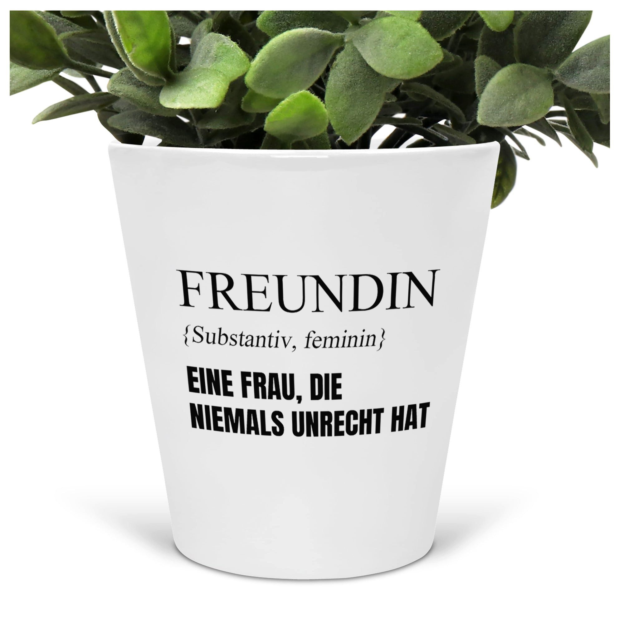 In Deutschland bedruckter weisser Blumentopif mit folgendem Spruch bzw. Motiv: Freundin - Eine Frau, die niemals unrecht hat