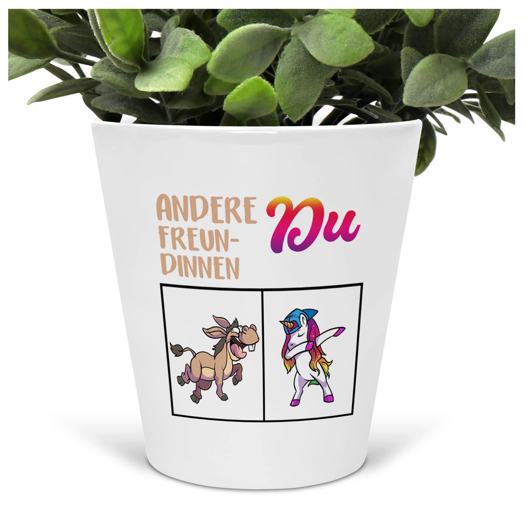 In Deutschland bedruckter weisser Blumentopif mit folgendem Spruch bzw. Motiv: Andere Freundinnen vs Du (Pferd vs Einhorn Dabbing)