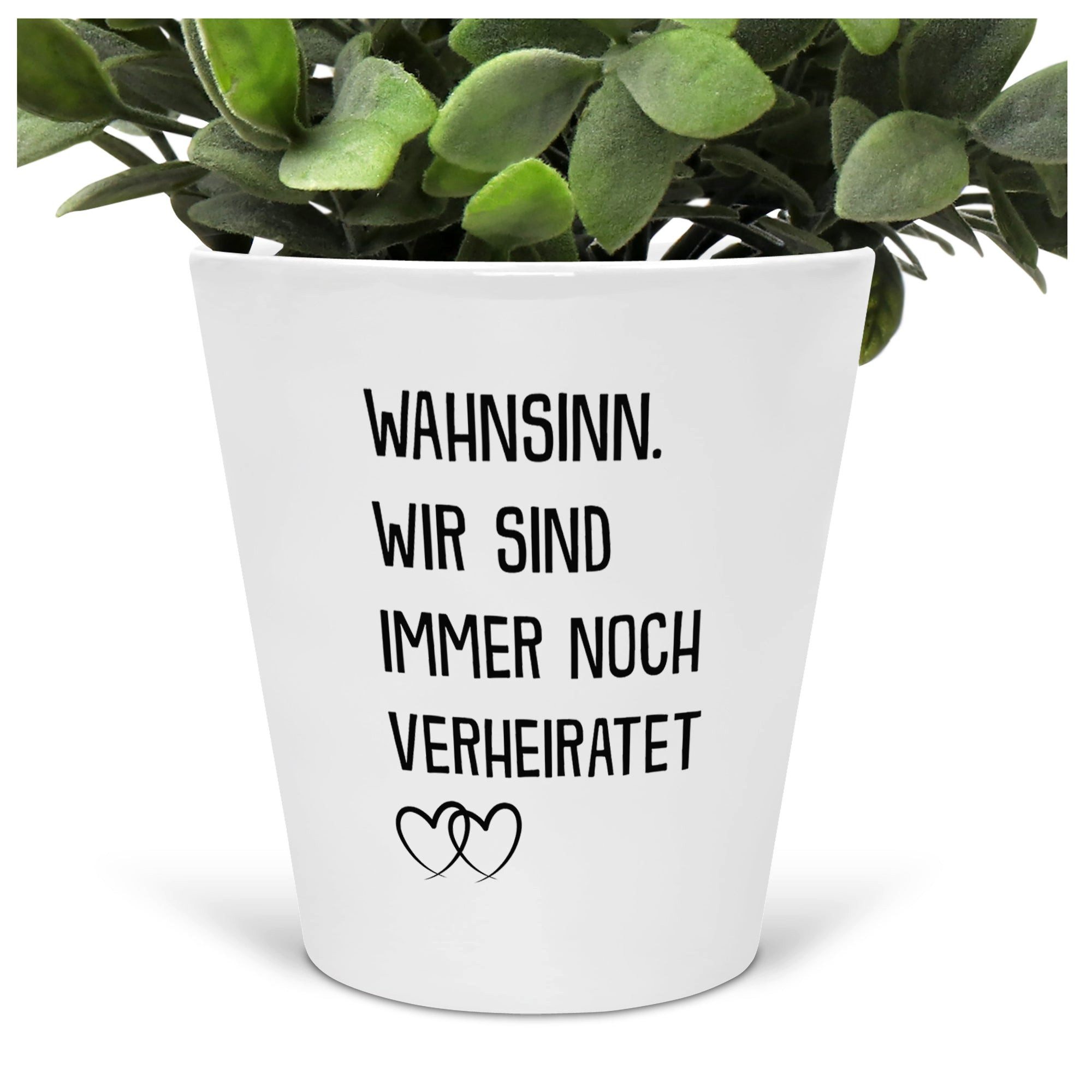 In Deutschland bedruckter weisser Blumentopif mit folgendem Spruch bzw. Motiv: Wahnsinn. Wir sind immer noch verheiratet