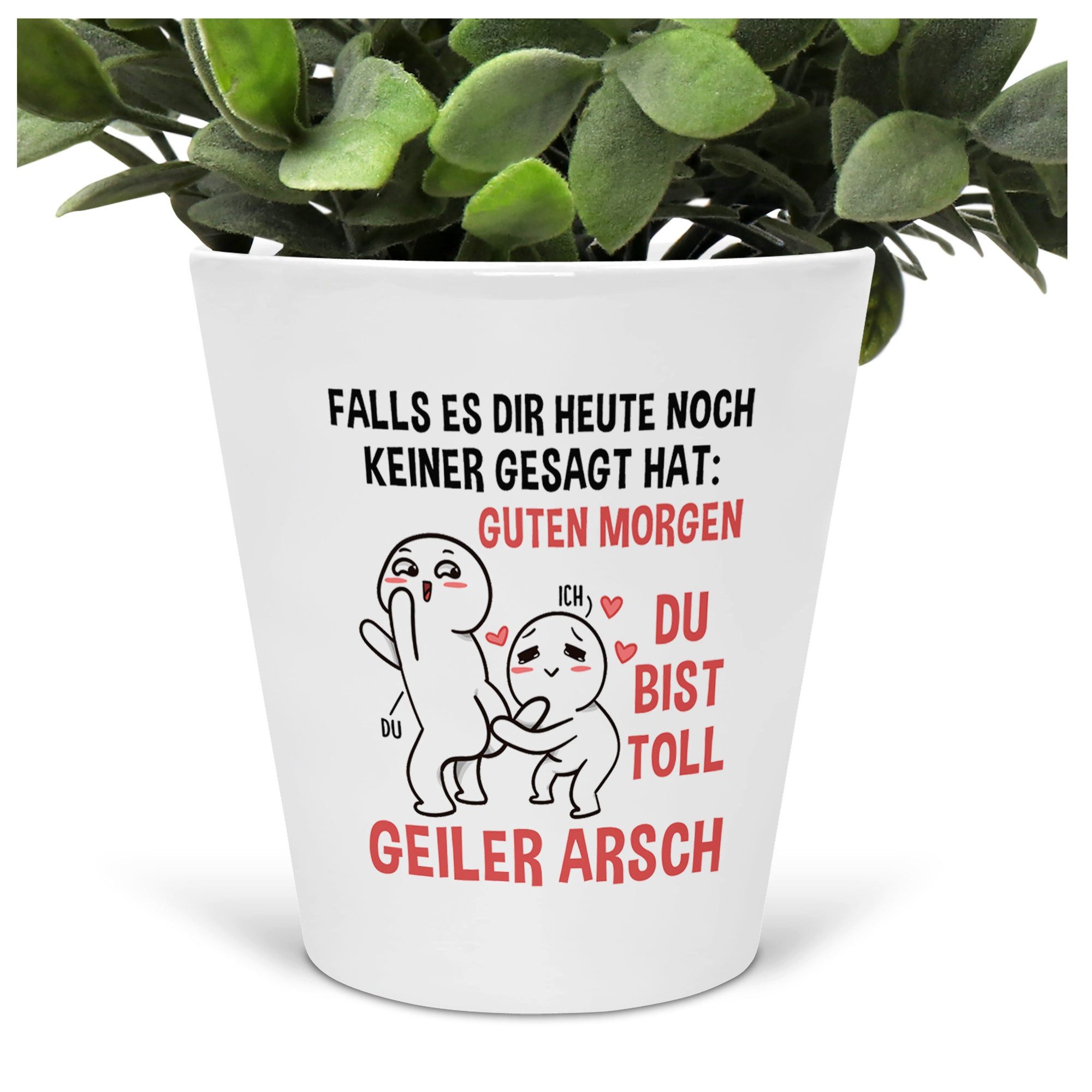 In Deutschland bedruckter weisser Blumentopif mit folgendem Spruch bzw. Motiv: Falls es dir heute noch keiner gesagt: Guten Morgen - Du Bist Toll - Geiler Arsch