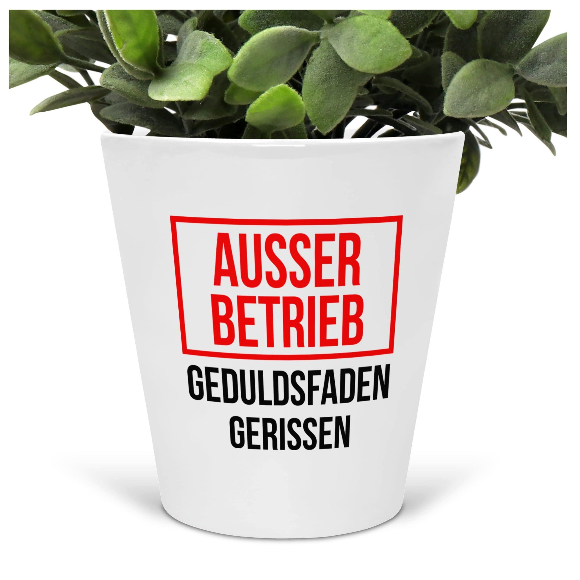 In Deutschland bedruckter weisser Blumentopif mit folgendem Spruch bzw. Motiv: Ausser Betrieb - Geduldsfaden Gerissen