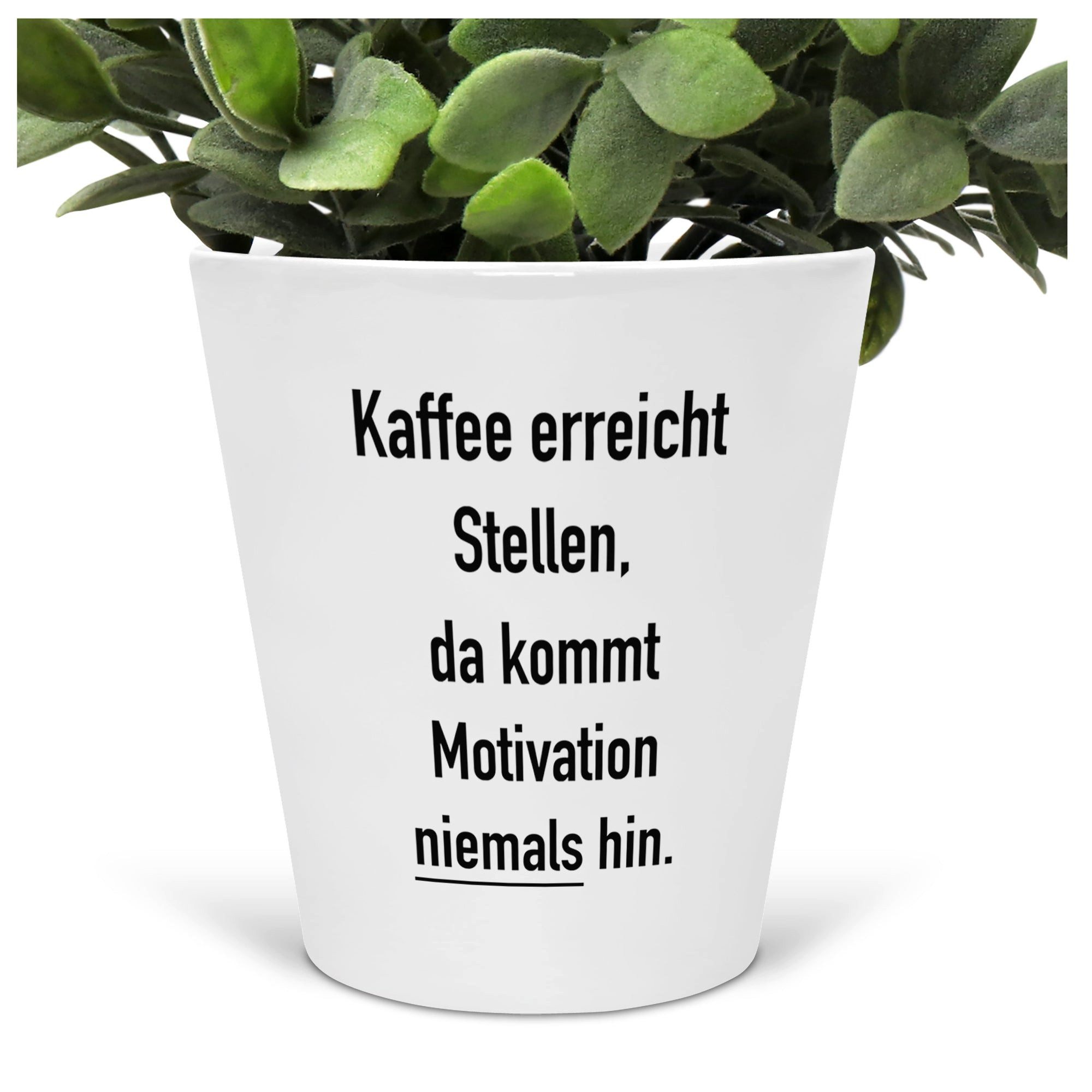 In Deutschland bedruckter weisser Blumentopif mit folgendem Spruch bzw. Motiv: Kaffee erreicht Stellen, da kommt Motivation niemals hin
