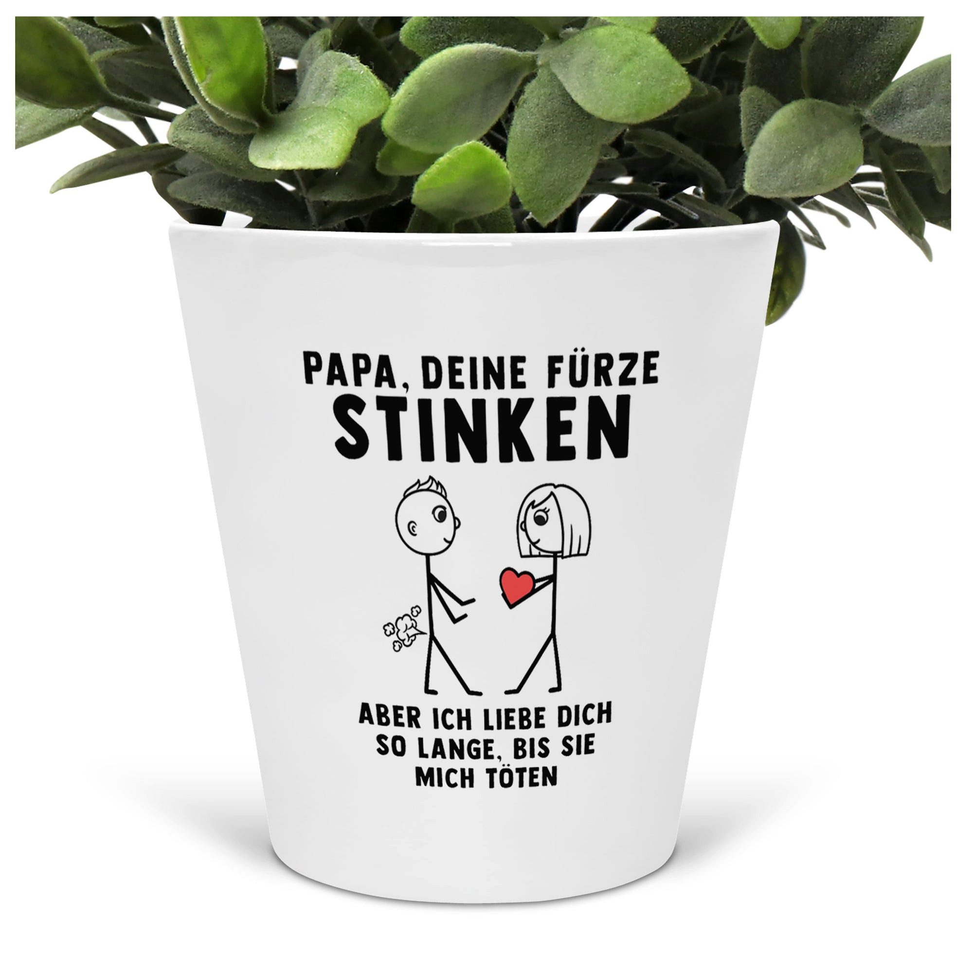 In Deutschland bedruckter weisser Blumentopif mit folgendem Spruch bzw. Motiv: Papa, Deine Fürze Stinken, Aber Ich Liebe Dich So Lange, Bis Sie Mich Töten