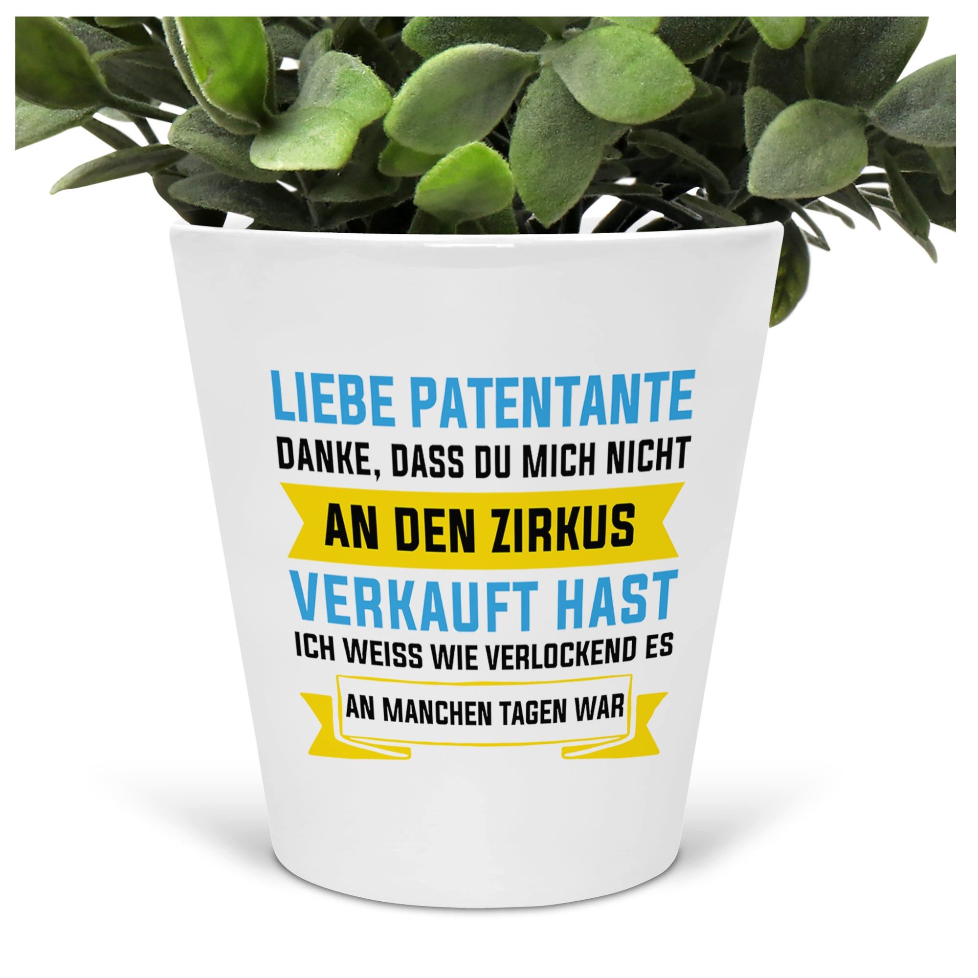 In Deutschland bedruckter weisser Blumentopif mit folgendem Spruch bzw. Motiv: Liebe Patentante, Danke, Dass Du Mich Nicht An Den Zirkus Verkauft Hast. Ich Weiss, Wie Verlockend Es An Manchen Tagen war