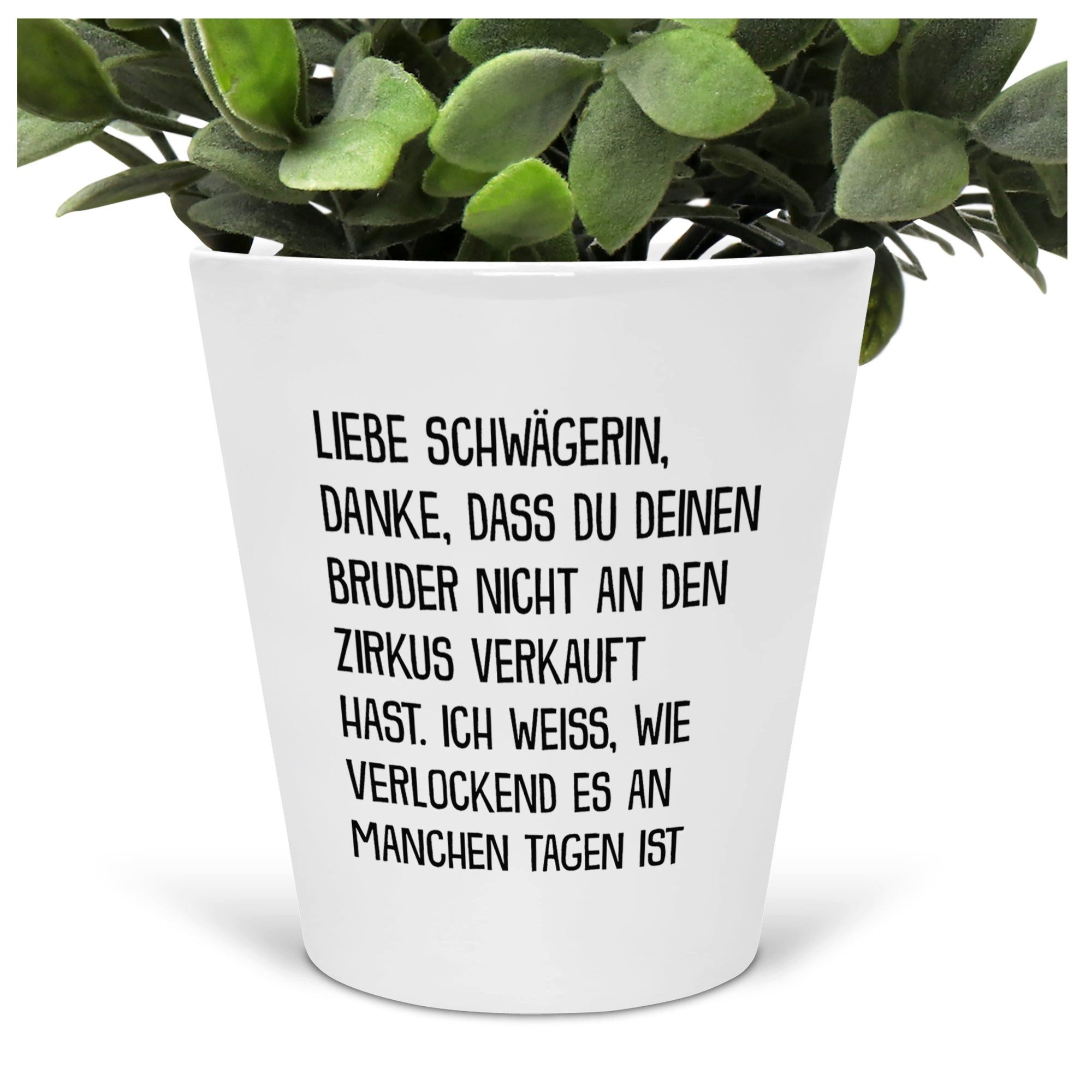 In Deutschland bedruckter weisser Blumentopif mit folgendem Spruch bzw. Motiv: Liebe Schwägerin, Danke, Dass Du Deinen Bruder Nicht An Den Zirkus Verkauft Hast. Ich Weiss, Wie Verlockend Es An Manchen Tagen War