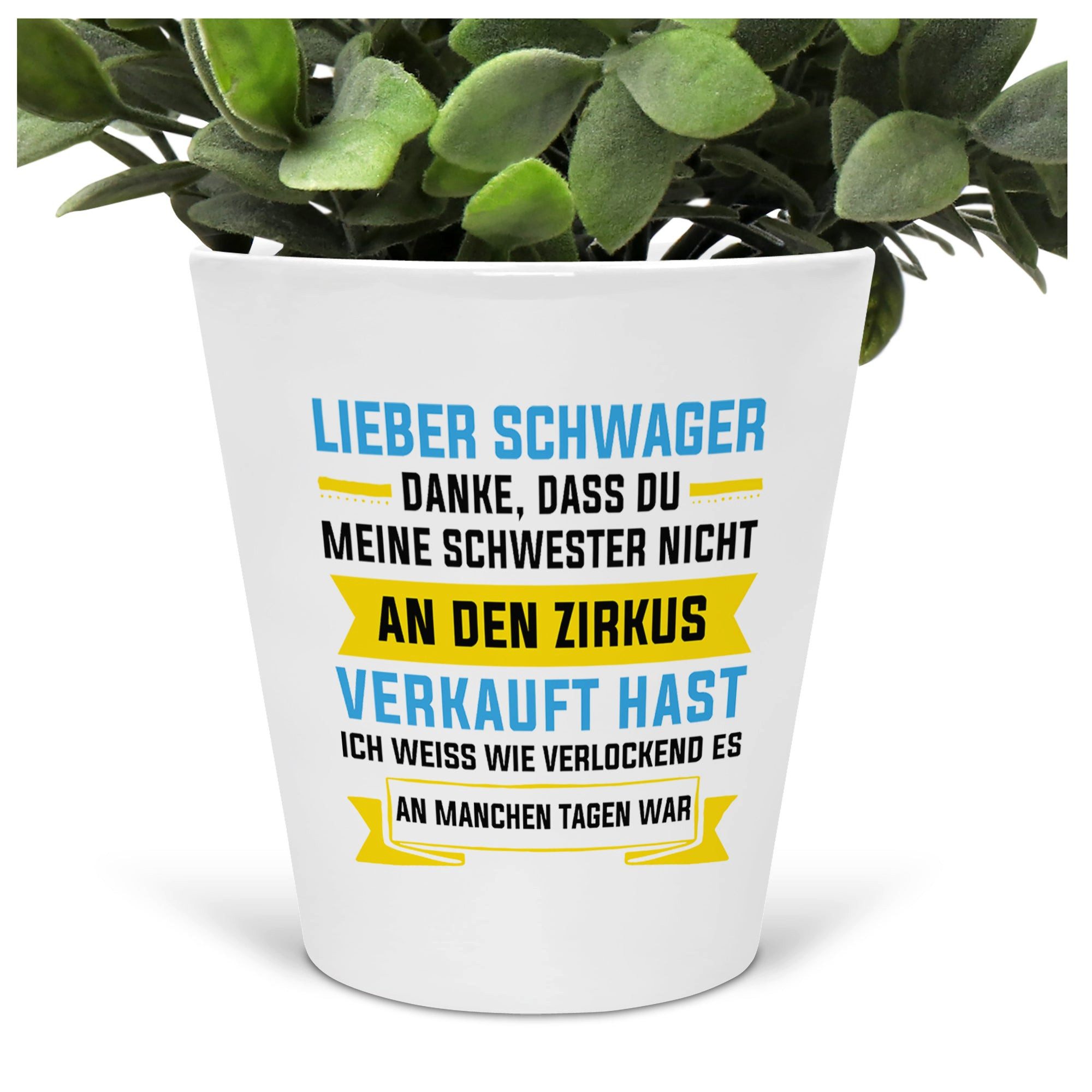 In Deutschland bedruckter weisser Blumentopif mit folgendem Spruch bzw. Motiv: Lieber Schwager, Danke, Dass Du Meine Schwester Nicht An Den Zirkus Verkauft Hast. Ich Weiss, Wie Verlockend Es An Manchen Tagen War