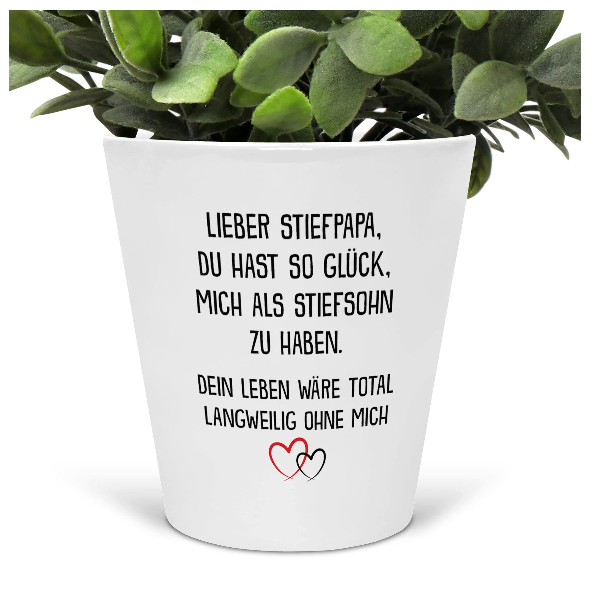 In Deutschland bedruckter weisser Blumentopif mit folgendem Spruch bzw. Motiv: Lieber Stiefpapa, Du hast so Glück, mich als Stiefsohn zu haben. Dein Leben wäre total langweilig ohne mich