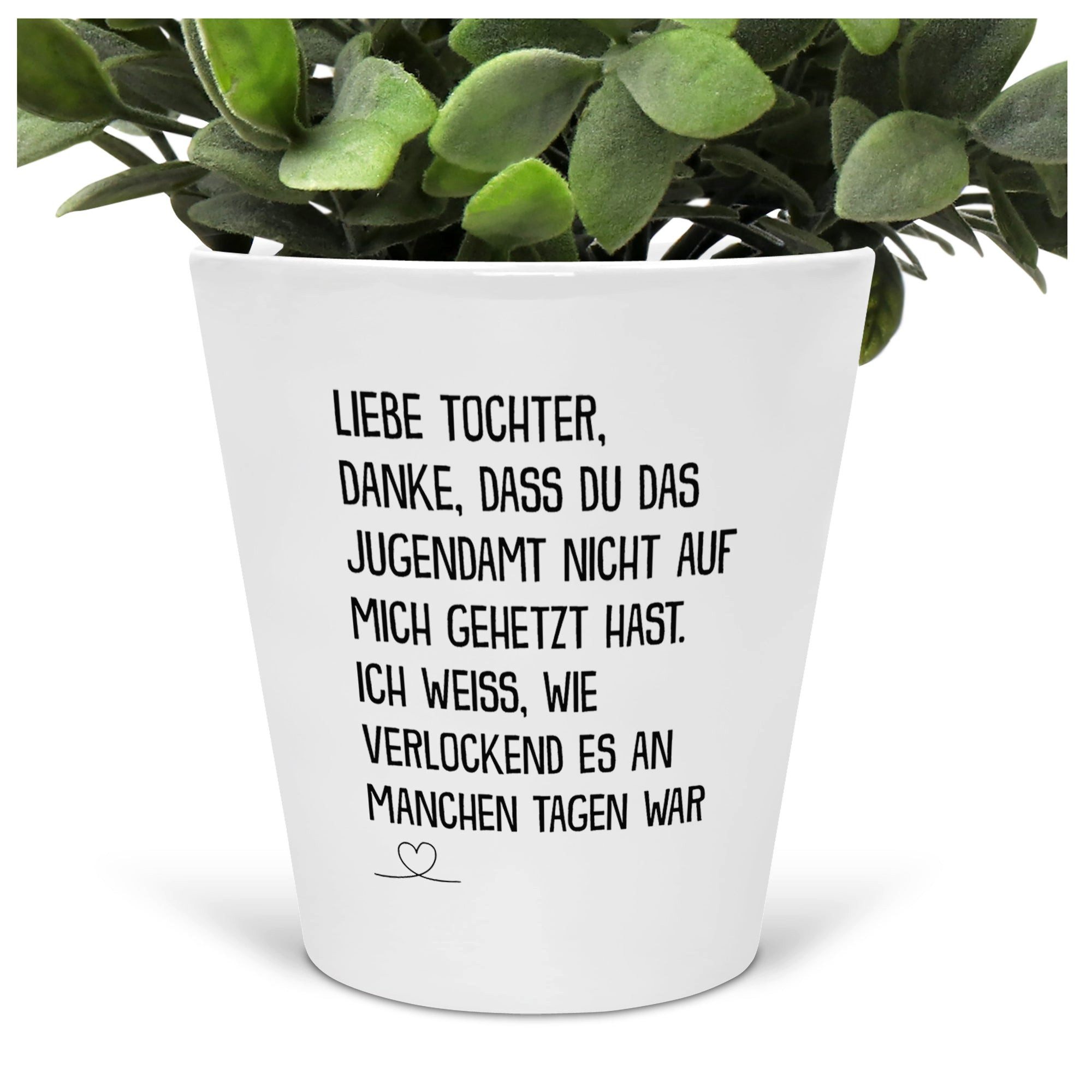 In Deutschland bedruckter weisser Blumentopif mit folgendem Spruch bzw. Motiv: Liebe Tochter, Danke, Dass Du Das Jugendamt Nicht Auf Mich Gehetzt Hast. Ich Weiss, Wie Verlockend Es An Manchen Tagen War