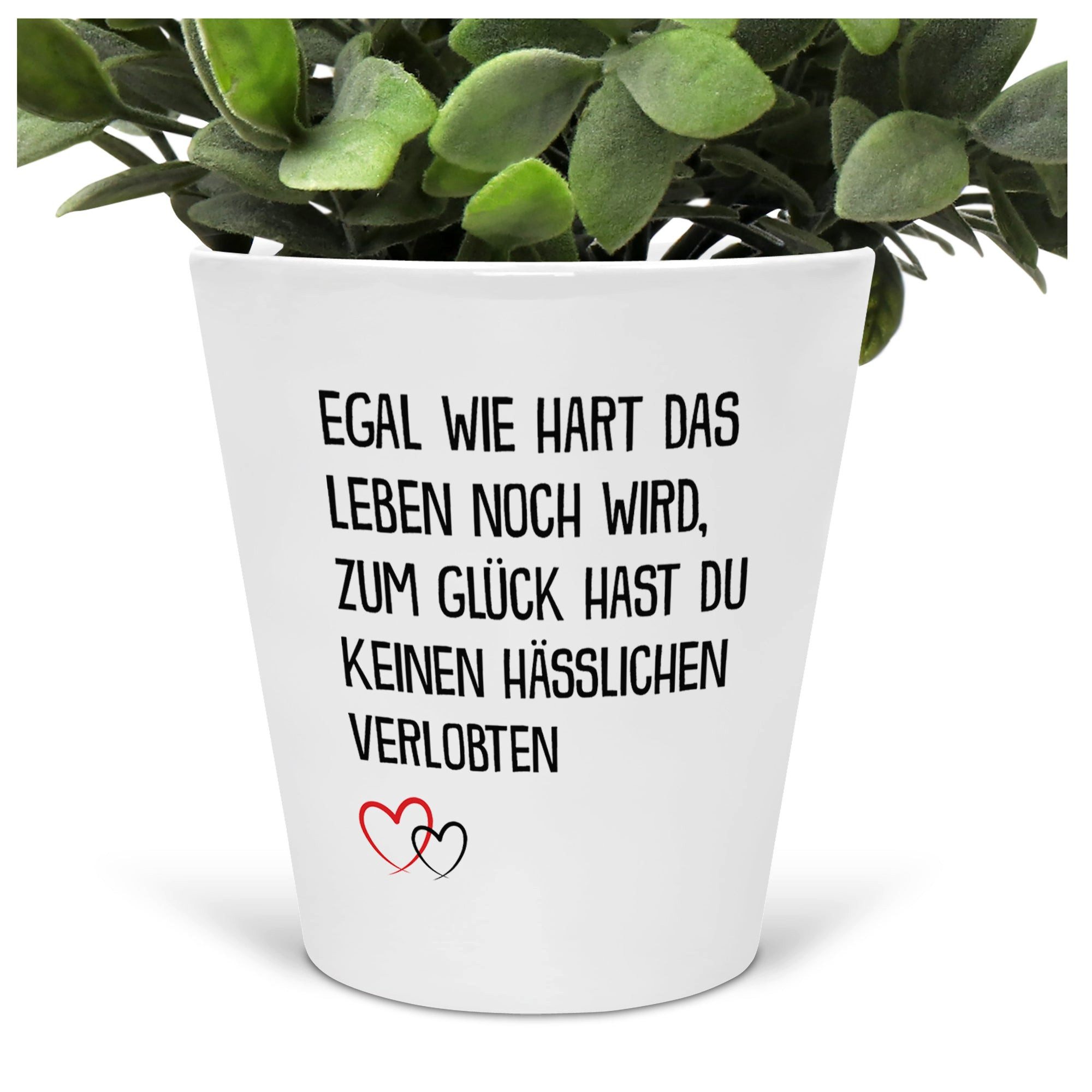 In Deutschland bedruckter weisser Blumentopif mit folgendem Spruch bzw. Motiv: Egal wie hart das Leben noch wird, zum Glück hast du keinen hässlichen Verlobten