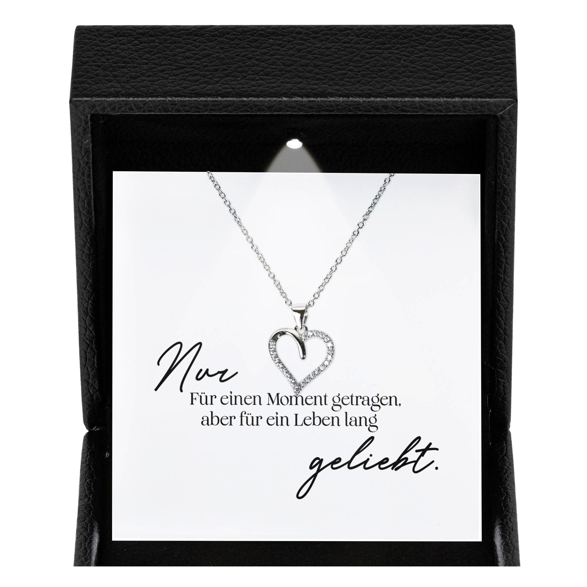 Diese Halskette beeindruckt nicht nur durch ihr Design, sondern auch durch ihre außergewöhnliche Präsentation: Das hochwertige Etui aus strukturiertem, schwarzem PU-Leder enthält ein integriertes LED-Licht, das beim Öffnen automatisch aktiviert wird und sowohl die funkelnde Kette als auch die liebevolle Botschaftskarte perfekt in Szene setzt.