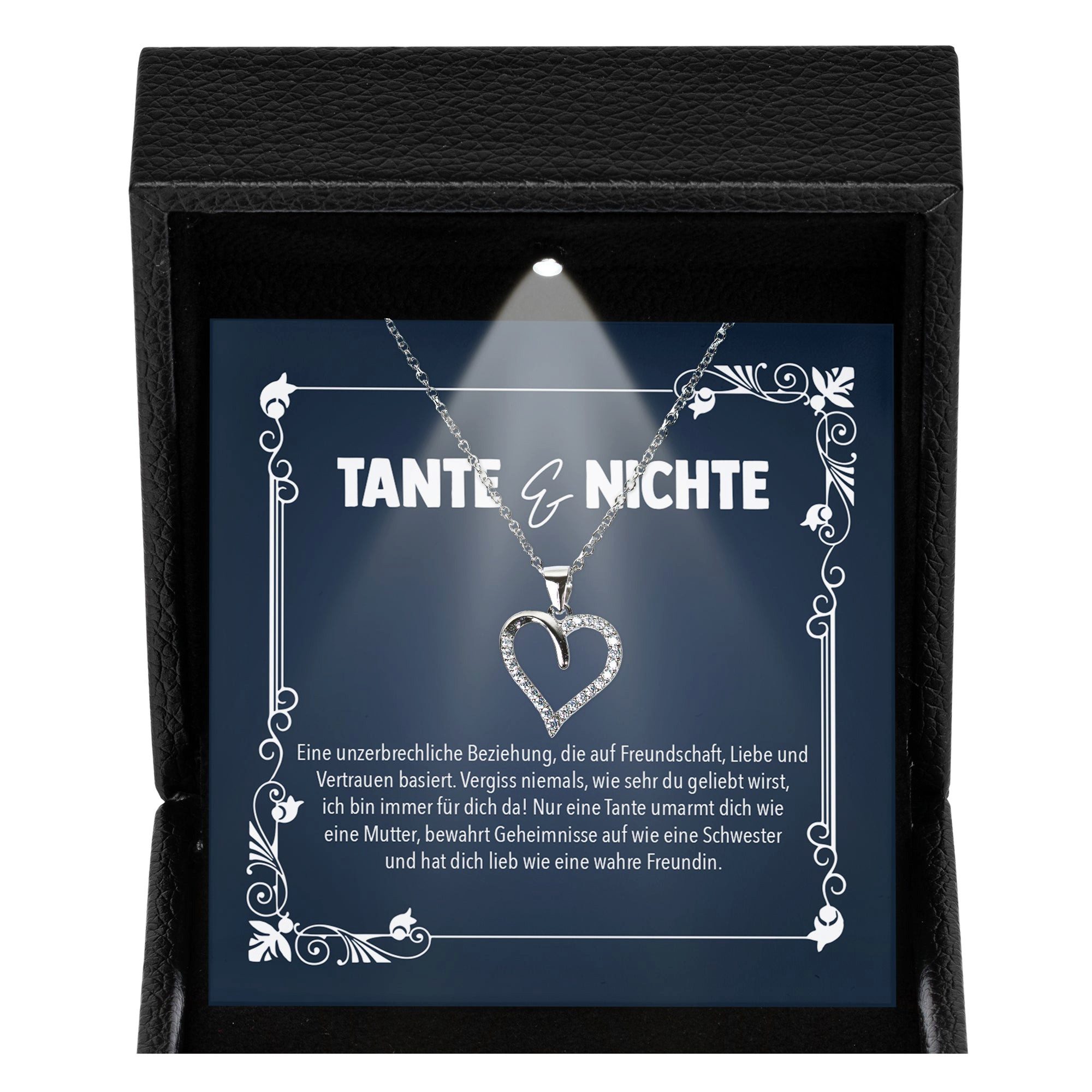 Diese Halskette beeindruckt nicht nur durch ihr Design, sondern auch durch ihre außergewöhnliche Präsentation: Das hochwertige Etui aus strukturiertem, schwarzem PU-Leder enthält ein integriertes LED-Licht, das beim Öffnen automatisch aktiviert wird und sowohl die funkelnde Kette als auch die liebevolle Botschaftskarte perfekt in Szene setzt.