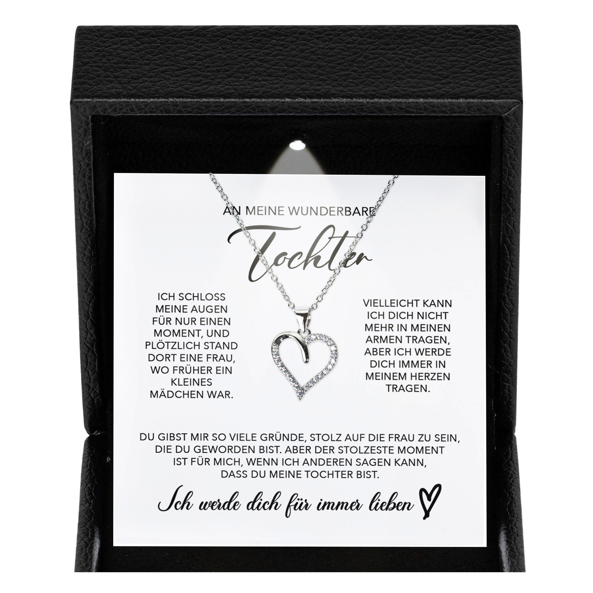 Diese Halskette beeindruckt nicht nur durch ihr Design, sondern auch durch ihre außergewöhnliche Präsentation: Das hochwertige Etui aus strukturiertem, schwarzem PU-Leder enthält ein integriertes LED-Licht, das beim Öffnen automatisch aktiviert wird und sowohl die funkelnde Kette als auch die liebevolle Botschaftskarte perfekt in Szene setzt.
