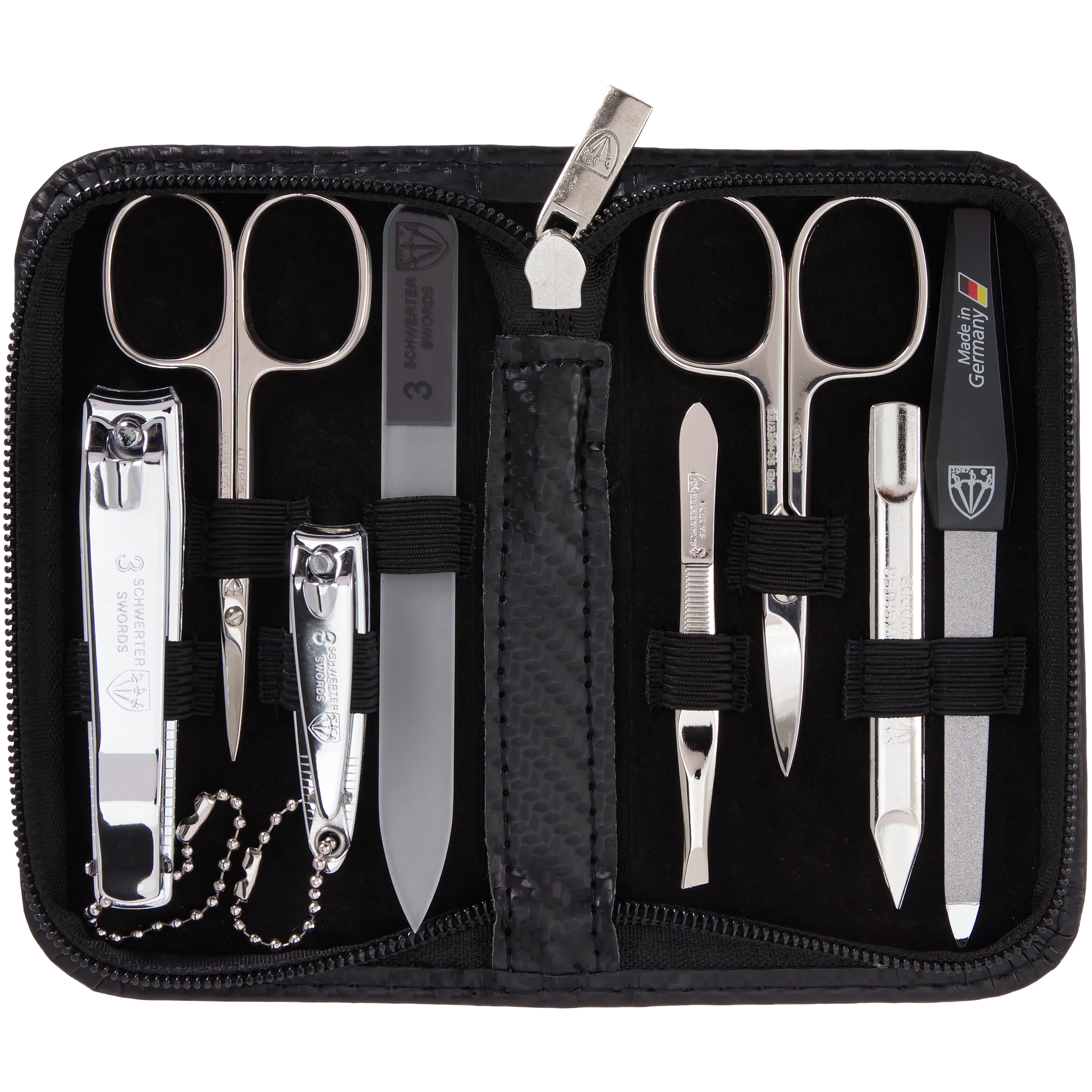 Das Set beinhaltet essentielle Werkzeuge wie eine Nagel- und Hautschere, zwei verschiedene Nagelknipser für präzises Schneiden, eine Pinzette für feinste Korrekturen, sowie eine Glas- und eine Saphirnagelfeile für ein glattes, schonendes Feilen. Ein Doppelinstrument für Nagelhaut und -reinigung rundet das professionelle Pflegeerlebnis ab.