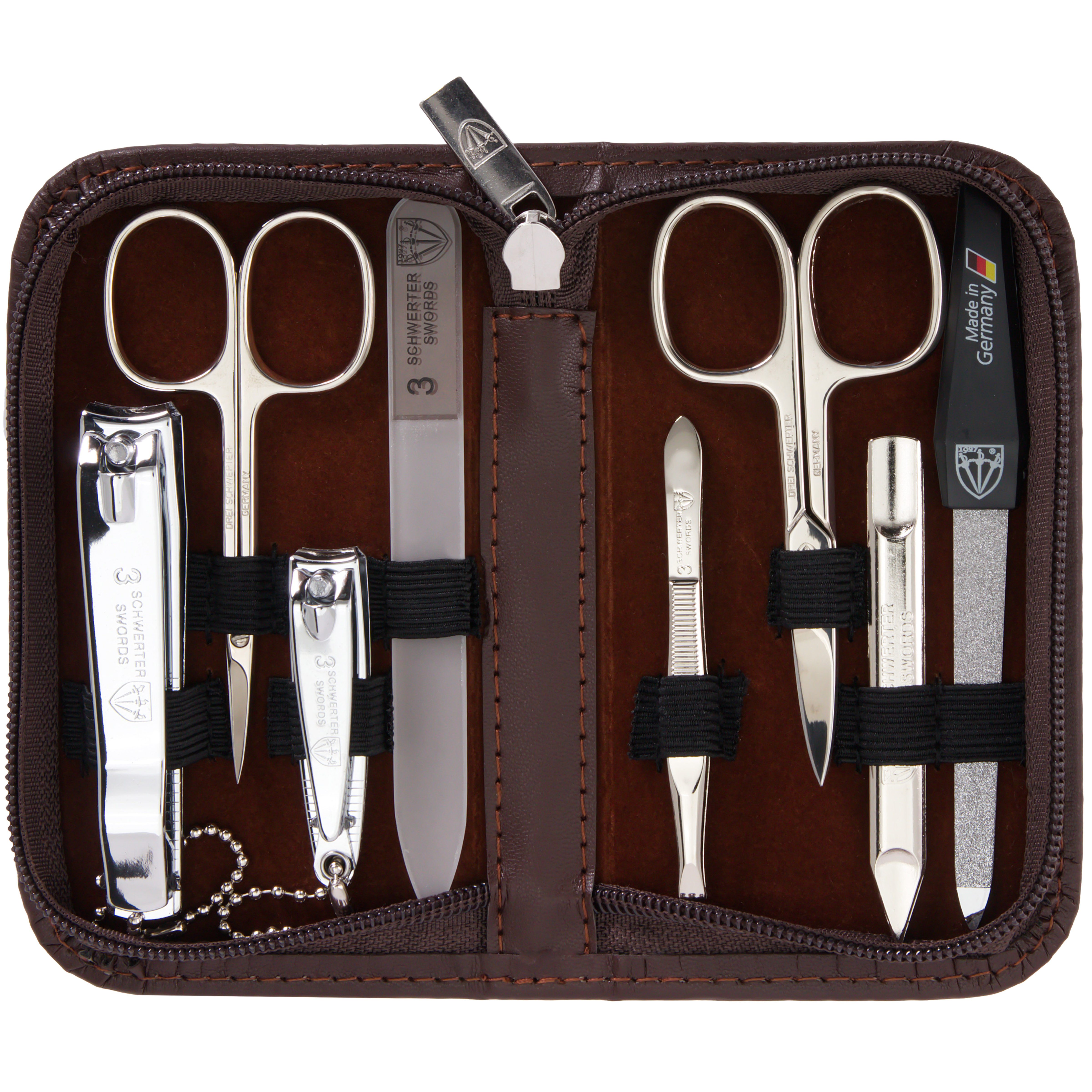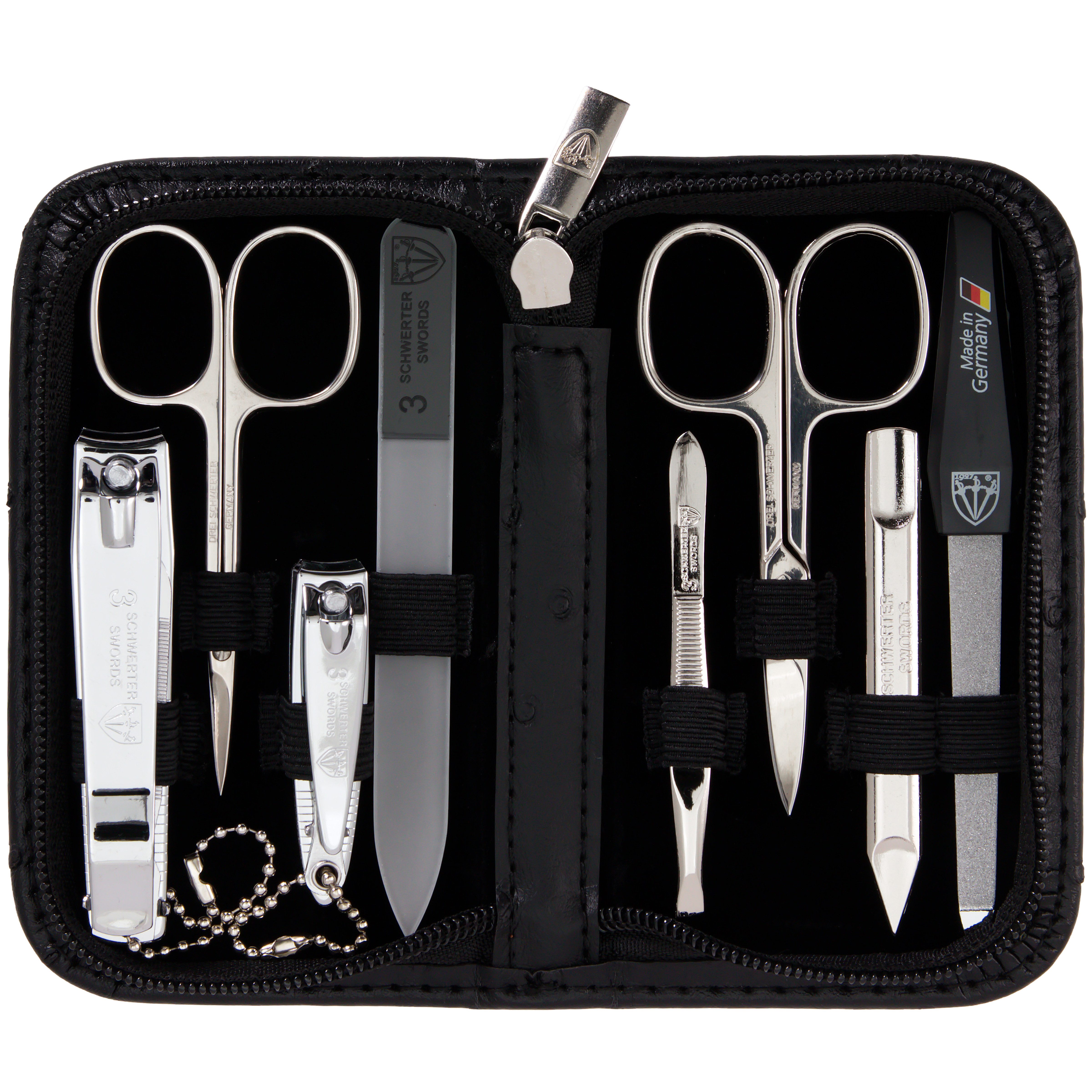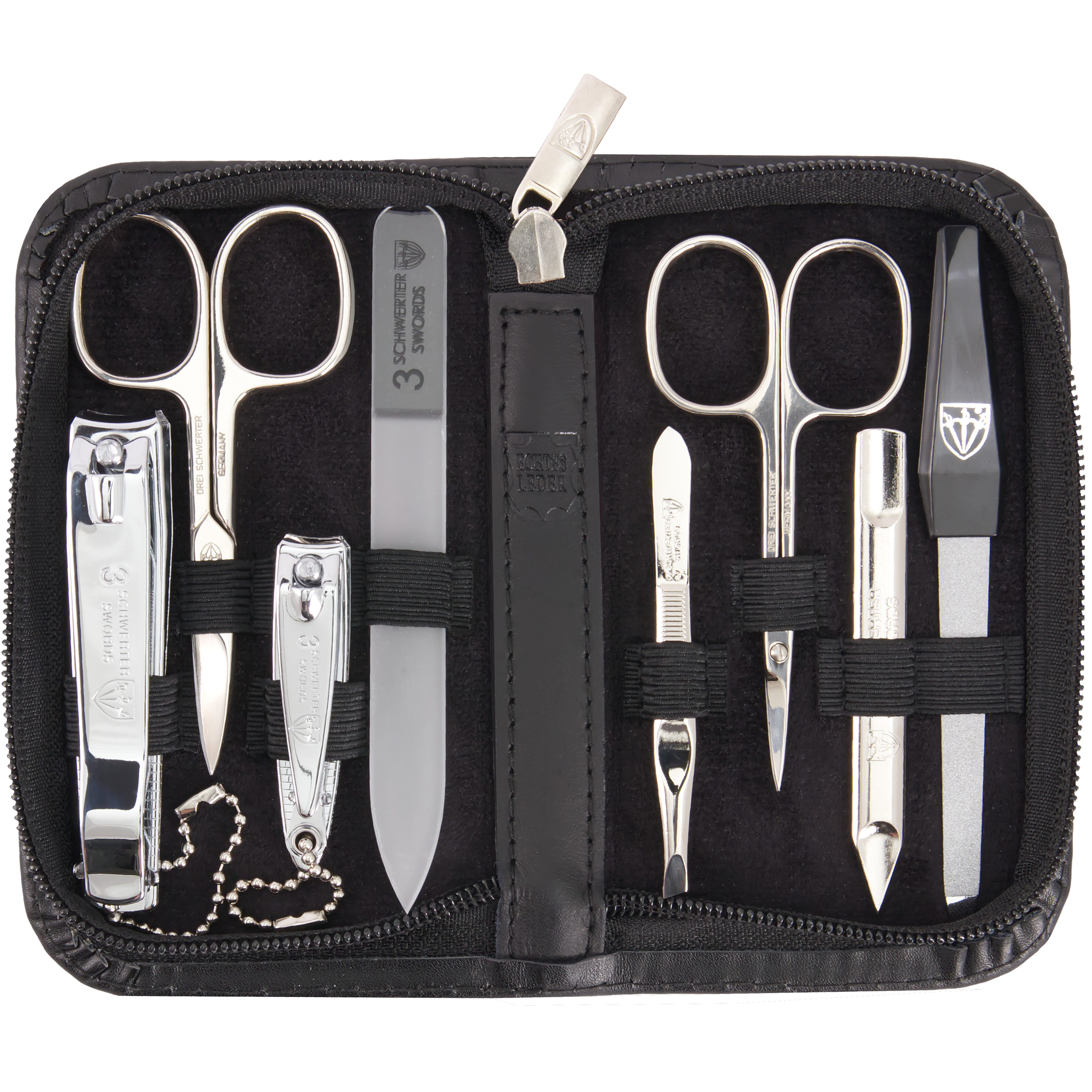 Jedes Instrument zeugt von der exzellenten Qualität, für die 3 SCHWERTER bekannt ist: Hochglanzvernickelte, polierte Stahlwerkzeuge garantieren Präzision bei jedem Schnitt und Feilenzug. Die Instrumente sind in einem eleganten Etui untergebracht, das mit seinem weichen Samtinnenfutter nicht nur Schutz bietet, sondern auch ein stilvolles Accessoire darstellt. Dank elastischer Halterungen sind die Werkzeuge sicher verstaut und dennoch leicht entnehmbar.