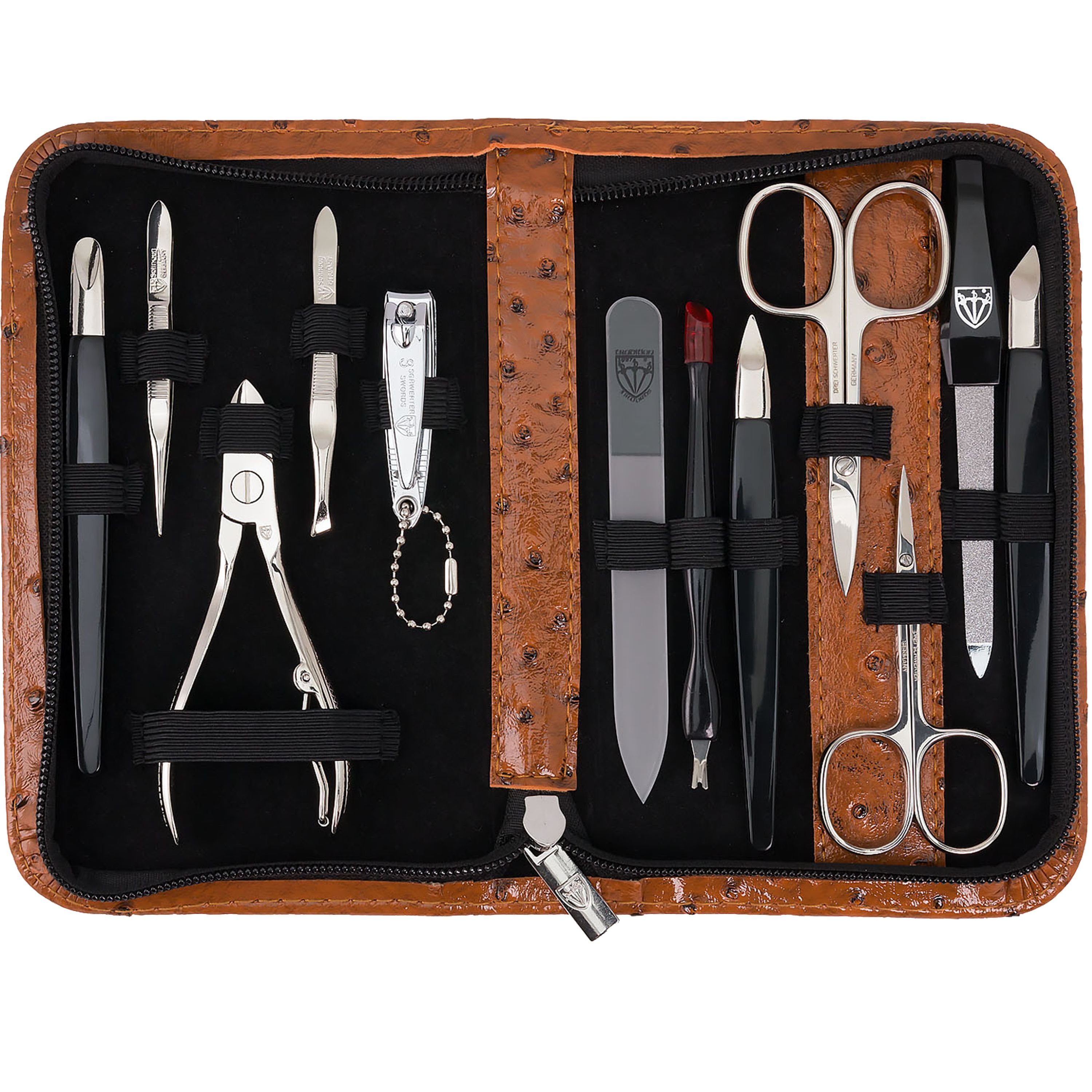 Das Set beinhaltet essentielle Werkzeuge wie eine Nagel- u. Hautschere, Nagelknipser, Pinzette (schräg), Pinzette (spitz), Glasnagelfeile, Saphirnagelfeile, Nagelhautentferner, Nagelzange, Drücker, Reiniger und Messer