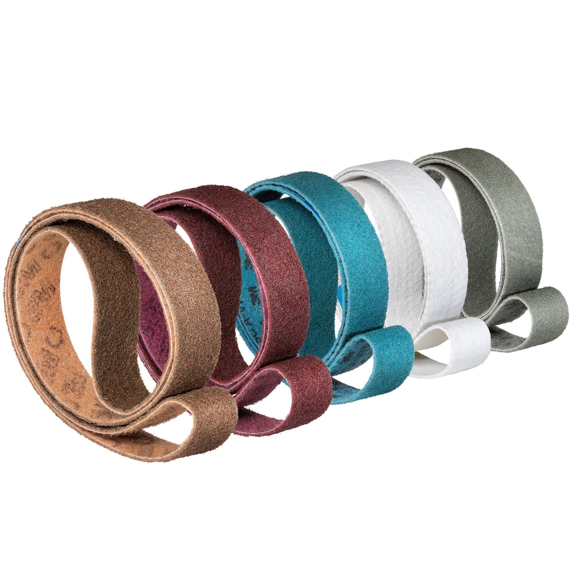Die dehnungsarmen Scotch-Brite Schleifbänder zur Oberflächenbearbeitung bestehen aus Aluminiumoxid- und Siliciumcarbid-Mineralien. Sie sind in verschiedenen Kombinationen erhältlich, darunter Aluminiumoxid mittel (A MED), Aluminiumoxid sehr fein (A VFN), Aluminiumoxid grob (A CRS), Siliciumcarbid mittel (S MED), Siliciumcarbid superfein (S SFN) und Siliciumcarbid sehr fein (S VFN).