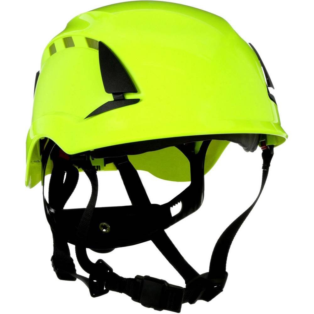 Mit dem 3M™ SecureFit™ Schutzhelm X5014VE CE erhalten Sie sicheren und bequemen Kopfschutz. Der Schutzhelm ist für zahlreiche Arbeitssituationen ideal geeignet, sowohl für Arbeiten in der Höhe, als auch an Einsatzorten, an denen schwere Maschinen im Einsatz sind oder mit anderen Gefährdungen zu rechnen ist. Unser belüfteter Schutzhelm entspricht den Zertifizierungsanforderungen der Normen EN 12492 und EN 397. Dank des speziellen Umstellsystems mit 4 Punkt Kinnriemen kann der Schutzhelm je nach Sicherheitsanforderung am Arbeitsplatz einfach auf die eine oder die andere Norm eingestellt werden. Inspiriert von modernen Kletterhelmen, erlaubt das randlose Design eine ungehinderte Sicht nach oben. So können mögliche Gefahrenpunkte in der Umgebung besser gesehen und gemieden werden. Sechs verschiedene Einstellungen ermöglichen die Anpassung an unterschiedliche Kopfformen. Mit dem leicht anpassbaren 6 Punkt Ratschenverschlusssystem lässt sich das Kopfband bequem entsprechend den Erfordernissen einstellen. In den Helm integriert ist die exklusive, patentierte 3M™ Druckverteilungstechnologie. Sie gewährleistet nicht nur einen sicheren Sitz, sondern verbessert auch den Tragekomfort. Diese Technologie reduziert die Kraft auf den Kopf gegenüber konventioneller 3M(TM) Helmbebänderung um bis zu 20%. Dieser neongrüne Schutzhelm ist mit einem patentierten 3M™ UVicator™ Sensor ausgestattet, dessen Farbe sich bei schädlicher UV Belastung von Rot zu Weiß ändert. Unter Einwirkung von UV Strahlung kann die Helmschale spröde werden, sodass der effektive Schutz eingeschränkt ist. An der Farbveränderung des Sensors ist zu erkennen, wann der Helm ersetzt werden sollte. Die vorhandenen Einkerbungen und Halterungen für Zubehör sind mit einer Vielzahl von 3M(TM) Schutzvisieren, Kapselgehörschützern und anderen Zubehörteilen kompatibel. Er erfüllt außerdem die Norm EN 50365 (1000 VAC)..