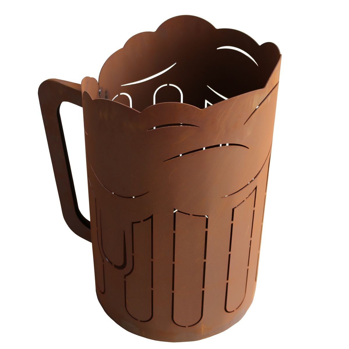 440s Rost Feuerkorb Bierkrug, H ca. 65 cm Hier wird das Feierabend-Bier zu einer ganz heißen Angelegenheit! Der witzige und unkonventionelle Feuerkorb in Gestalt eines Bierkrugs ist rundum schön anzusehen und ein Hingucker auch wenn keine Flammen aus seinem Inneren in den Himmel züngeln. Material: Stahlblech gerostet Maße: ca. 65 x 60 x 38,5 cm (HxTxD) Sicherheitshinweise: Der Feuerkorb darf nur auf nichtbrennbaren Untergründen aufgestellt werden! Wegen Funkenflugs bitte genug Abstand zu brennbaren Objekten einhalten! Feuer NIE unbeaufsichtigt brennen lassen! Anmerkung: Im Korbboden sorgt ein kleines Bohrloch dafür, dass (Regen)-Wasser jederzeit abfließen kann. Hinweis: Der Artikel wurde in Bayern hergestellt. Minimale Abweichungen zum Bild sind möglich, denn Rosten ist ein natürlicher Vorgang, deshalb kann die Farbe des Rostes variieren. Dieses Angebot gilt für ein Stück 440s Rost Feuerkorb Bierkrug, Höhe ca. 65 cm, Artikel FE-1-592, OHNE Deko oder sonstigem Zubehör.
