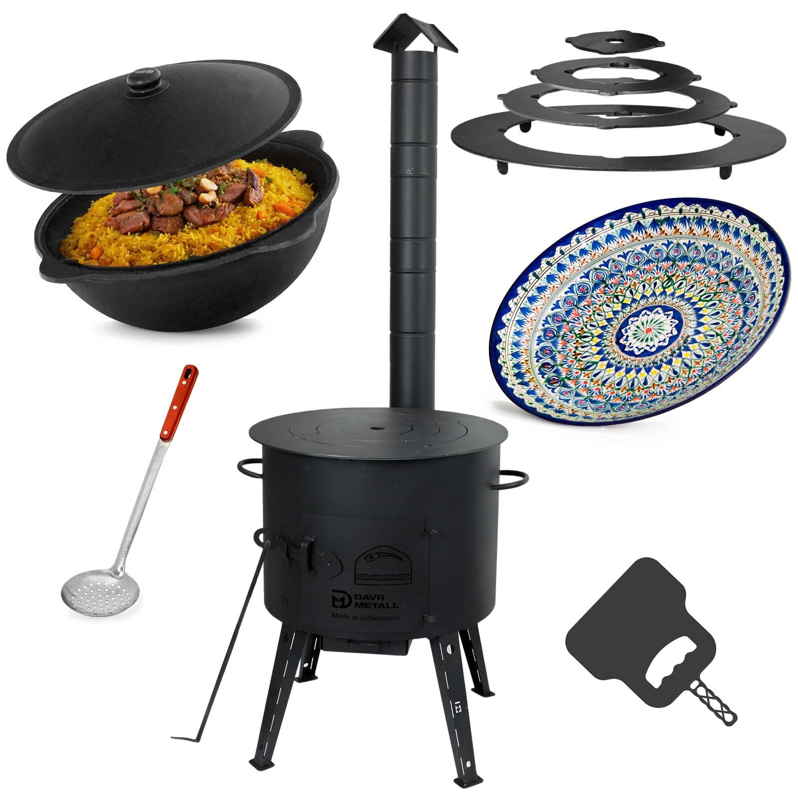 Lieferumfang | 1x Uchag (Füße, Feuerhaken, Schornstein) 1x Kazan mit Deckel aus Aluminum 1x Grillfächer 1x Schaumkelle 1x Orientalischer Teller 4x Adapter-Ringe |