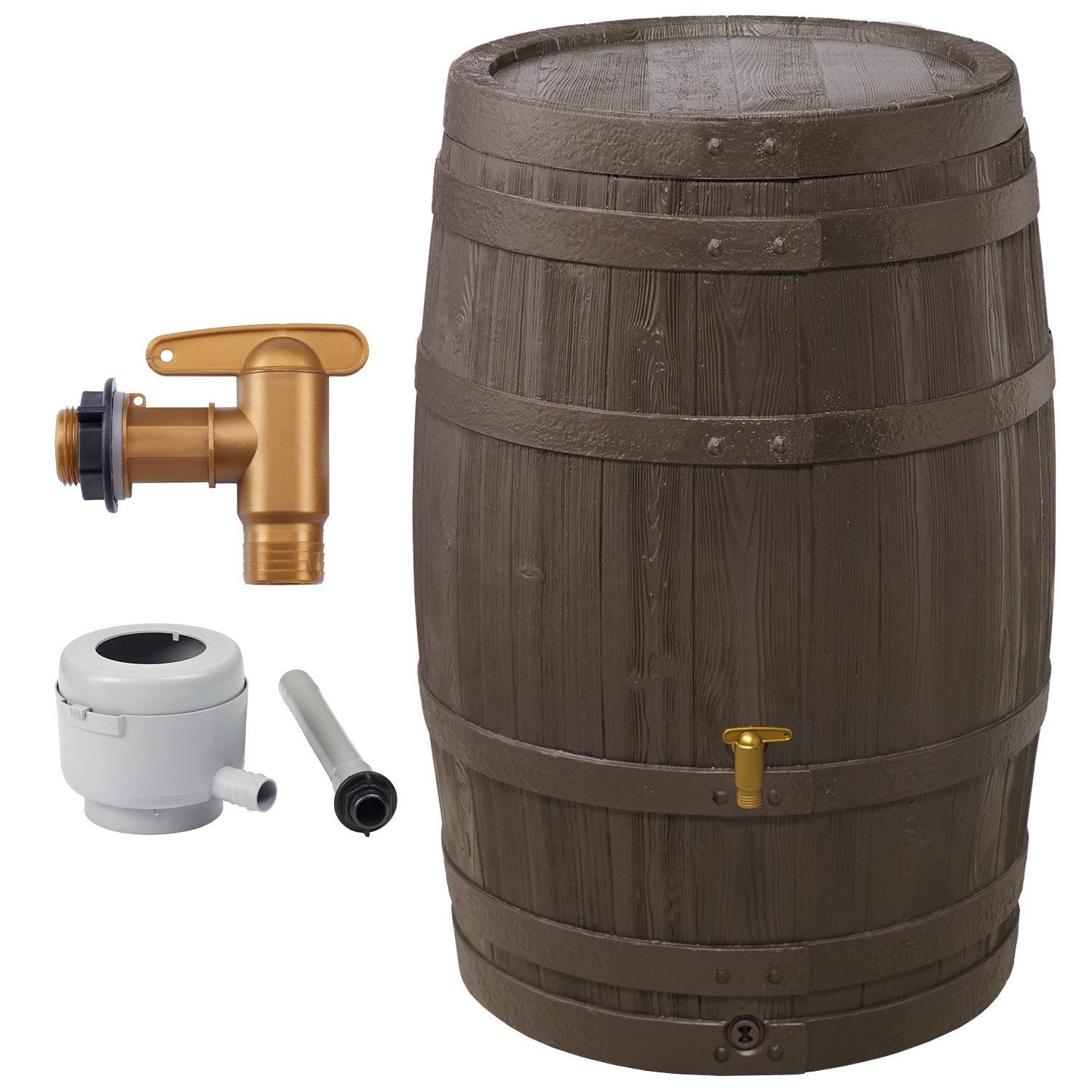 4rain Regenfass Vino dunkelbraun - als anschlussfertiges Komplett-Set! Es handelt sich um eine Regentonne in Form eines rustikalen Holzfasses mit täuschend echt wirkender, dunkelbrauner Holzstruktur. Der abnehmbare Deckel zur Wasserentnahme verfügt über eine integrierte Kindersicherung durch Bajonett-Verschluss. Entscheiden Sie sich für eine nachhaltige Gartenbewässerung, schonen Sie wertvolle Ressourcen und vor allem Ihren Geldbeutel. Sammeln Sie ab sofort Regenwasser, das ohnehin kostenlos vom Himmel fällt. Das Regenfass bietet Ihnen hierfür ein Speichervolumen von 250 Litern. Der Behälter verfügt außerdem über zwei Gewindeanschlüsse 19 mm (3/4") zur Wasserentnahme, z. B. für die Montage des mitgelieferten Auslaufhahns, eines Schlauchsets (optionales Zubehör) oder zur Restentleerung vor der Frostperiode. Der im Lieferumfang enthaltene Fallrohranschluss filtert zuverlässig Verschmutzungen aus dem Regenwasser, füllt die Regentonne automatisch und verhindert ein Überlaufen des vollen Tanks. Es werden nur 16 mm Abstand zwischen Fallrohr und Hauswand benötigt. Einfache Umstellung von Sommer- auf Winterbetrieb. Geeignet für Fallrohre mit einem Durchmesser von 70-100 mm (DN 70-100). Die Das Regenfass ist besonders robust und langlebig - witterungsbeständige Materialien mit hohem UV-Schutz sorgen für eine lange Lebensdauer beim Einsatz im Freien. Bereits bei der Entwicklung eines 4rain Produkts wird sehr viel Wert auf ein nachhaltiges Produktdesign gelegt. Dieser Regenwasserbehälter wird aus Recyclingkunststoff hergestellt und ist auch wieder zu 100 % recycelbar. Qualität "Made in Germany". Hinweis: Behälter muss bei Frostgefahr im Winter vollständig entleert werden.