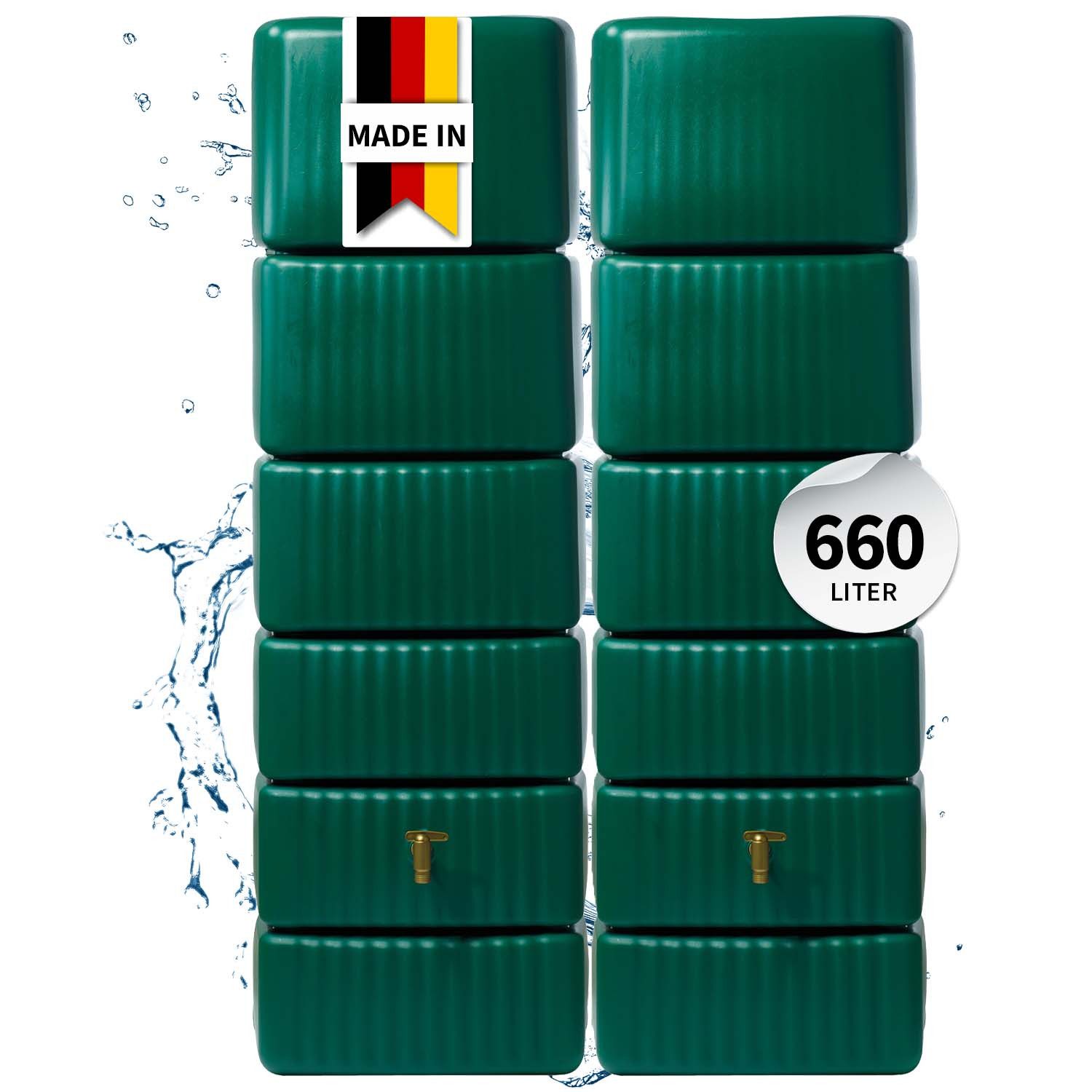 4rain Slim Wandtank SET 660 L dunkelgrün - der klassische Regenwasserbehälter mit zeitloser, schlichter Optik. Vielfältige Gestaltungsmöglichkeiten, durch moderne Farbgebung in dunkelgrün. Dieses Wandtank-Set zur Aufstellung an der Hauswand besteht aus zwei Behältern á 330 Liter, was einem gesamten Speichervolumen von 660 Litern entspricht. Entscheiden Sie sich für eine Эко-товарe Gartenbewässerung, schonen Sie wertvolle Ressourcen und vor allem Ihren Geldbeutel. Sammeln Sie ab sofort Regenwasser, das ohnehin kostenlos vom Himmel fällt. Der Behälter verfügt über zwei Gewindeanschlüsse 19 mm (3/4") zur Wasserentnahme, z. B. für die Montage des mitgelieferten Auslaufhahns, eines Schlauchsets (optionales Zubehör) oder einfach zur Restentleerung vor der Frostperiode. Zusätzlich befindet sich auf der Oberseite der Regentonne eine Deckelöffnung mit einem Durchmesser von 18 Zentimetern. Besonders robust und langlebig - witterungsbeständige Materialien mit hohem UV-Schutz sorgen für eine lange Lebensdauer beim Einsatz im Freien. Bereits bei der Entwicklung eines 4rain Produkts wird sehr viel Wert auf ein nachhaltiges Produktdesign gelegt. Dieser Regenwasserbehälter wird aus Recyclingkunststoff hergestellt und ist zu 100 % recycelbar. Qualität "Made in Germany". Hinweis: Behälter muss bei Frostgefahr im Winter vollständig entleert werden.