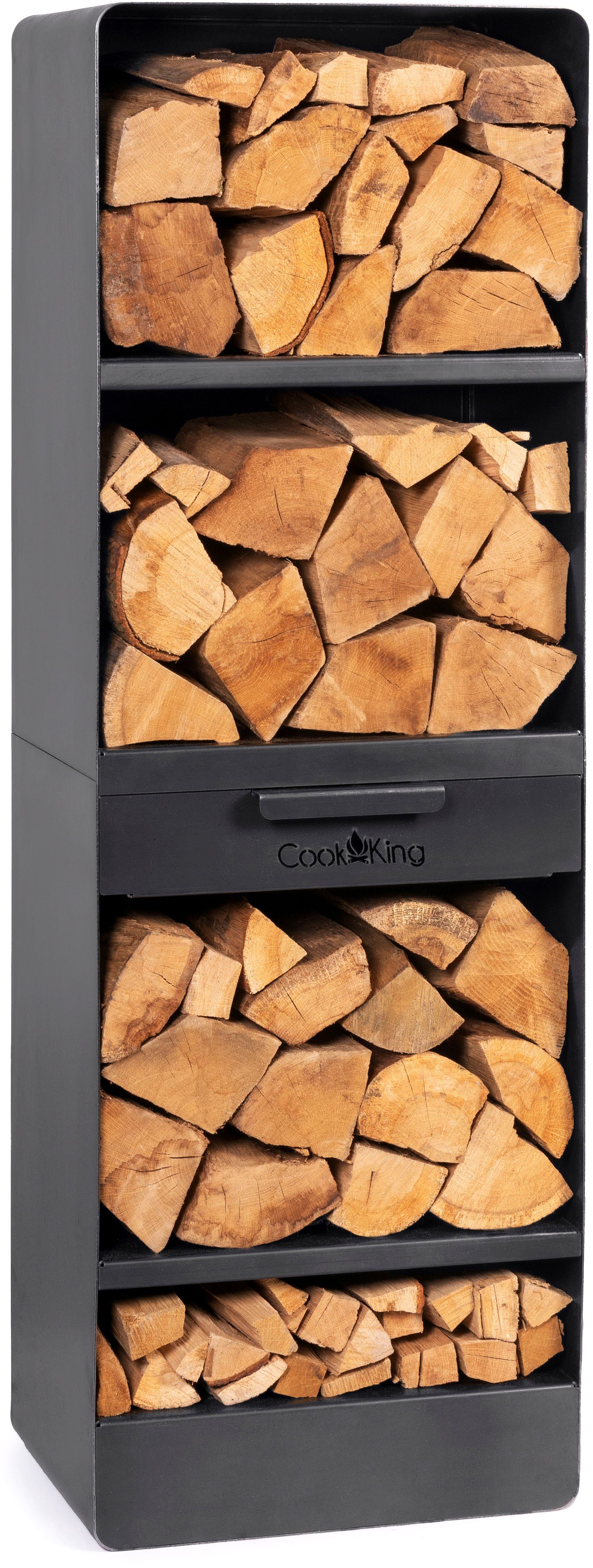CookKing Stahl Kaminholzregal Vento, Schwarz, 40x30x120 cm Funktionales Design, maximaler Stauraum, handmade in Europe — das Kaminholzregal Vento von CookKing punktet mit 4 Ablagen und einer praktischen Schublade! Mit dem ansprechenden Brennholzregal Vento von CookKing bringst du im Handumdrehen Ordnung in dein Brennholz. Ob auf der Terrasse oder neben dem Kamin im Wohnzimmer, das Brennholzregal Vento fügt sich dank der simplen Konstruktion aus schwarzem Stahl hervorragend in die Umgebung ein. Das funktionale Holzregal ist horizontal in drei große und eine kleine Lagerfläche unterteilt, sodass du sowohl Brennholz als auch Anbauholz ordentlich und griffbereit lagern kannst. Der Clou: Mittig ist beinahe unsichtbar eine Schublade angebracht, in der du Feuerzeug, Streichholz, Anzünder und Co. griffbereit lagern kannst. Vento von CookKing ist echte Handarbeit, und lässt Designanspruch sowie Funktionalität perfekt in einem ansprechenden Produkt verschmelzen. Hinweis: Mit der Zeit verändert eine gewollte Patina die Optik deines Kaminholzregals von CookKing und macht daraus dein individuelles Einzelstück. Besonderheiten: * Kaminholzregal aus Rohstahl * In Handarbeit verschweißte Konstruktion * Handmade in Europe! * 3 große Regalflächen * Kleinere Regalfläche für Anzündholz * Inkl. einer praktischen Schublade * Robust & witterungsbeständig * Universelle Nutzung für Garten, Terrasse oder Balkon * Indoor- und Outdoornutzung möglich * Lieferung am Stück, keine Montage erforderlich