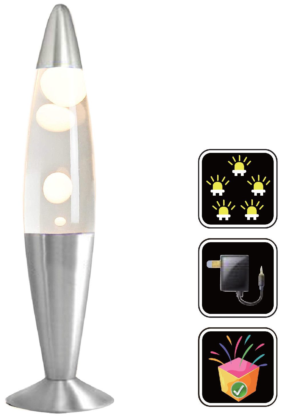 Wachsblasen steigen in der 35cm hohen Raketenförmigen Tischlampe auf und lassen sie zum Hingucker werden. Sockel und Spitze der Lampe sind matt-Silber und verleihen der Lampe ein hochwertiges Aussehen. Zudem muss sie nicht fest installiert werden, sondern kann bequem über ein Netzteil angeschlossen werden.