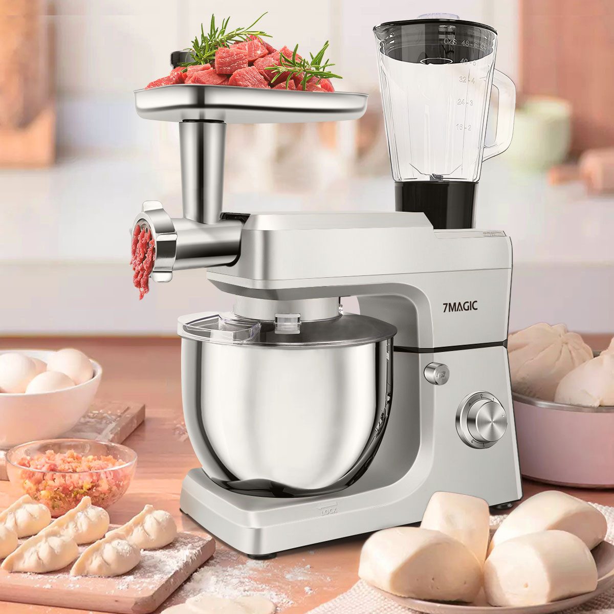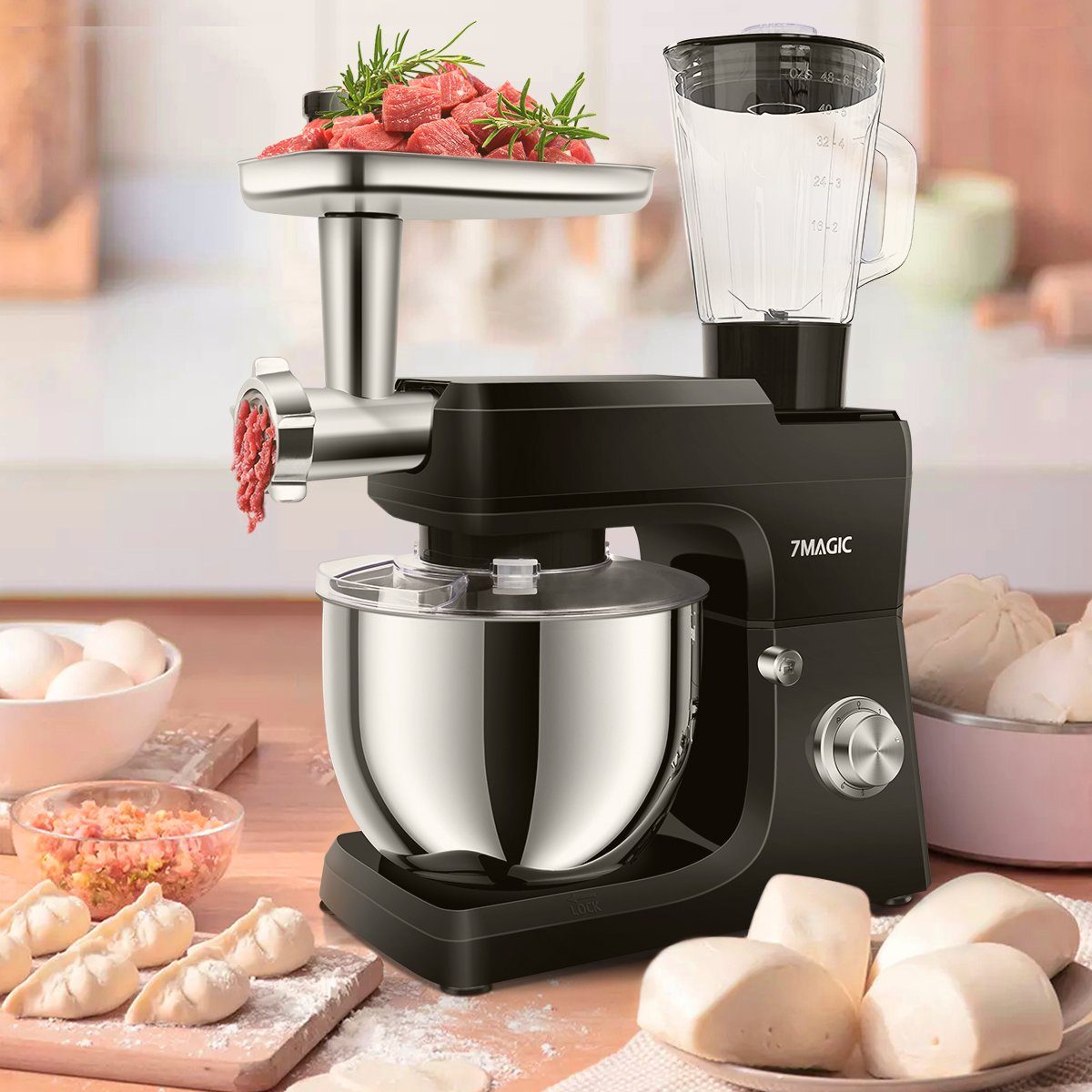 Mitgeliefertes Zubehör | 7-Liter-Edelstahlbecken*1 (Spülmaschinenfest) Fleischwolf (Messer*1+Dichtung*3)*1 (Spülmaschinenfest) Edelstahltablett*1 (Spülmaschinenfest) Mehlwannenabdeckung*1 (Handwäsche) Glas-Mixbecher (Deckel*1, 150-ml-Messbecher)*1 (Spülmaschinenfest) Gesichtshaken aus Aluminiumdruckguss*1 (Handwäsche) Blumenmesser aus Aluminiumdruckguss*1 (Handwäsche) Kunststoff-Verbindungskopf-Schneebesen*1 (Handwäsche) Propellerstange*1 (Handwäsche) Anleitungsheft*1 Verpackungsbox*1 |