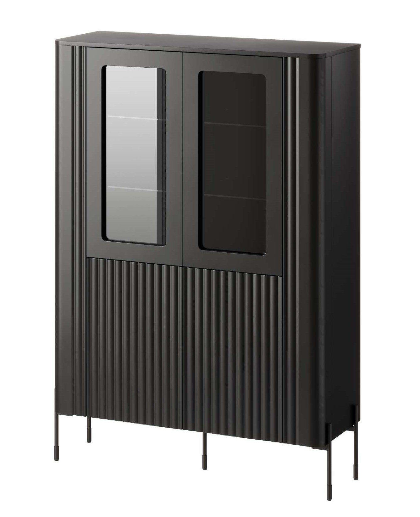 (Standvitrine, Wohnmöbel) mit Glastüren, aus Holzwerkstoff, schwarze Metallfüße
