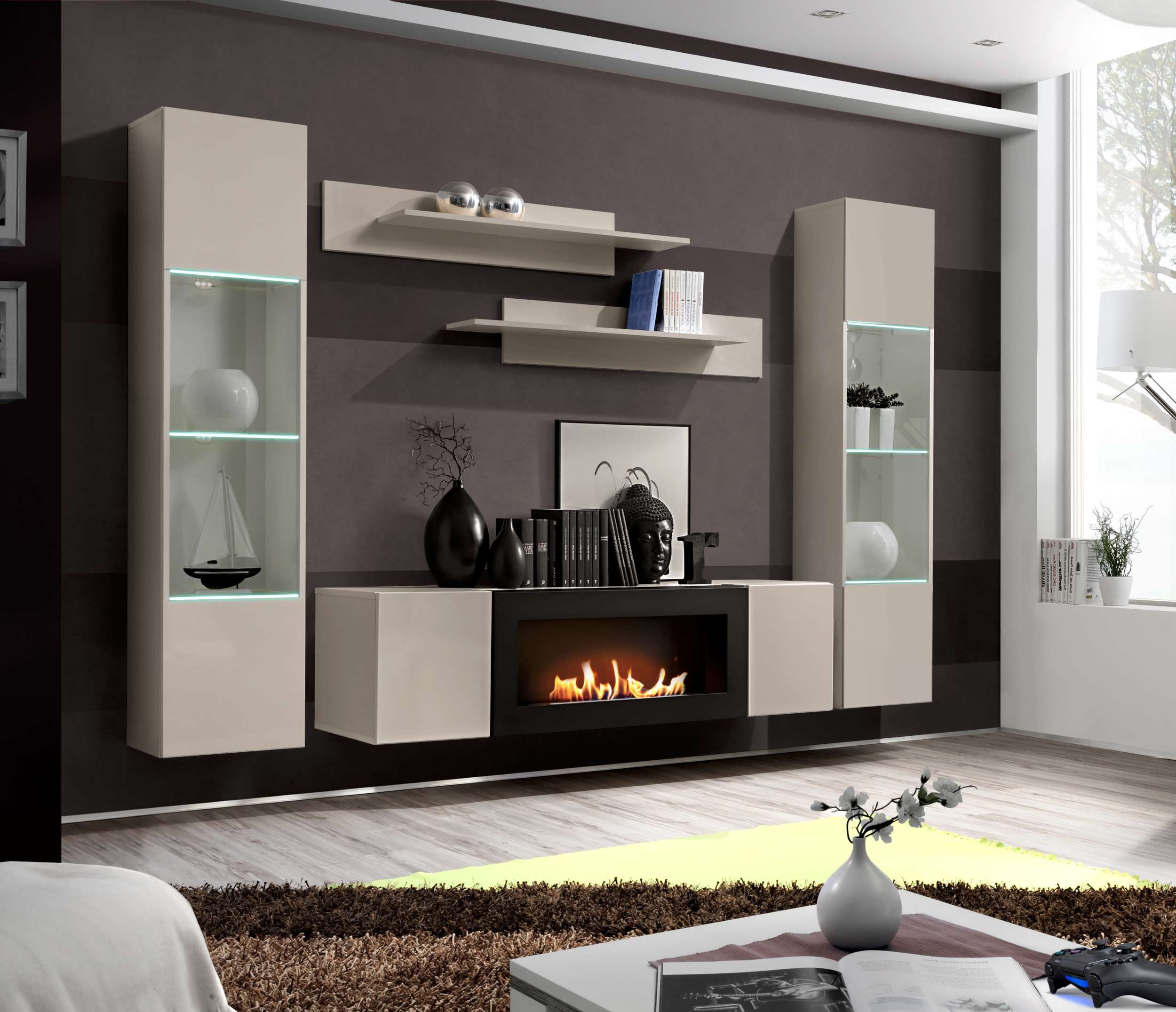 (Wohnzimmer-Set, Wohnmöbel), 2 x Hängevitrine mit LED, Lowboard mit Biokamin, 2 x Wandregal