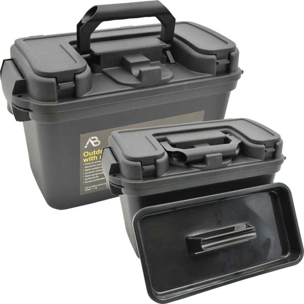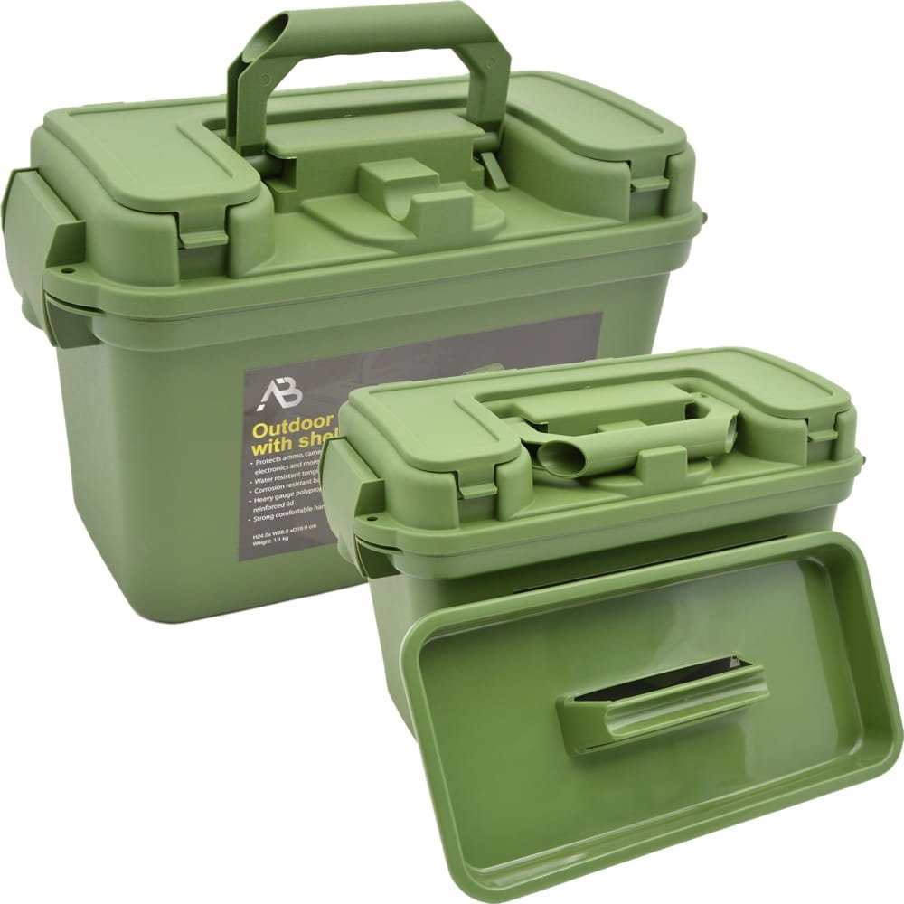 Diese praktische Outdoor Box aus Kunststoff ist wetterfest und extrem widerstandsfähig. Sie hat eine leicht öffnende Klapplade und ein herausnehmbares Innenfach für Kleinteile. Außerdem ist sie abschließbar durch die dafür vorgesehene Lochung und bietet viel Stauraum. Praktisch nutzbar als Werkzeugkiste und Transportbox, aber auch als Munitionskiste.