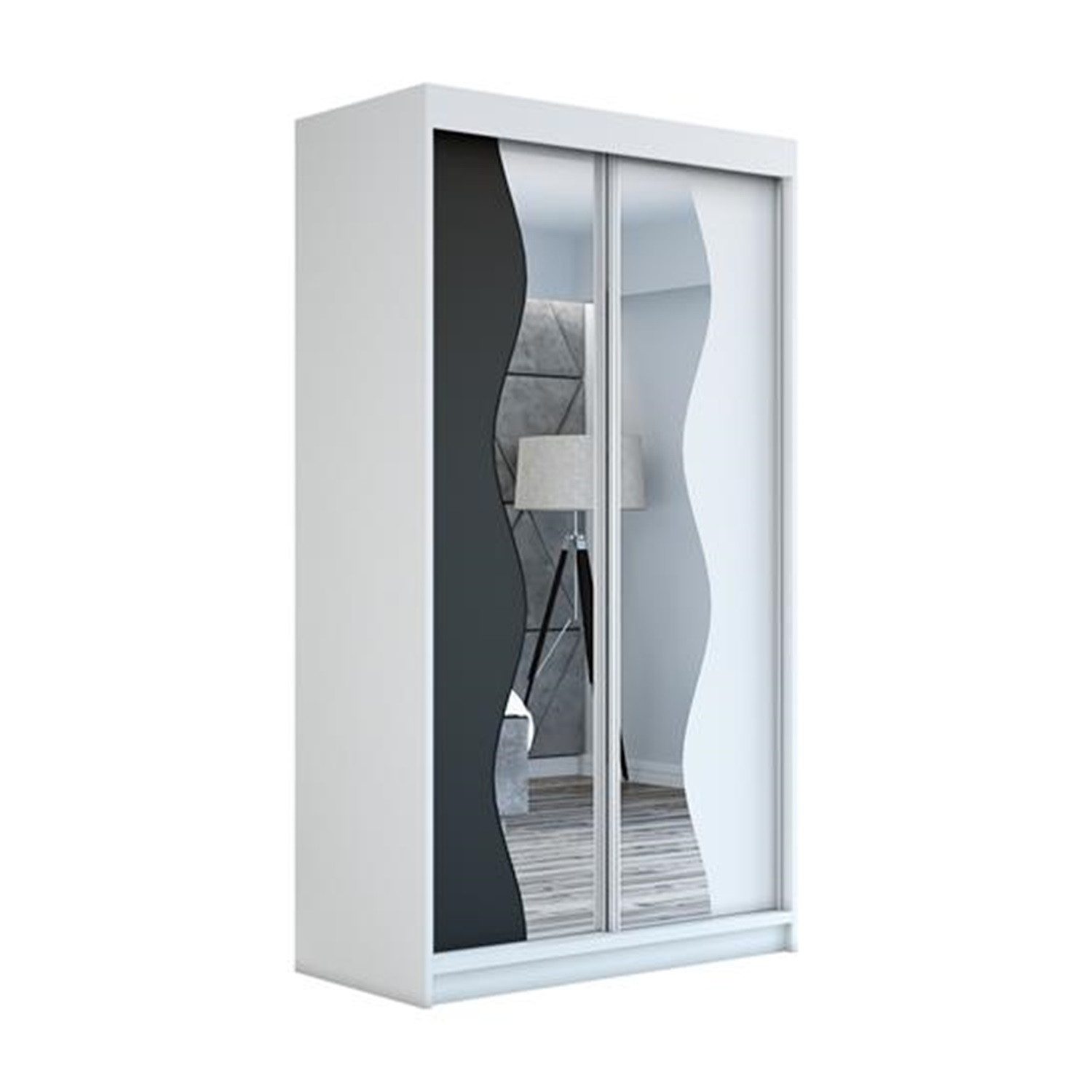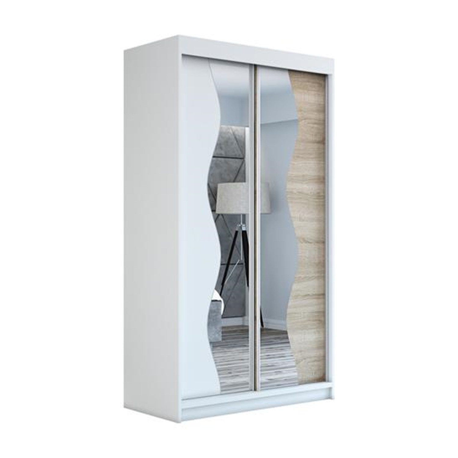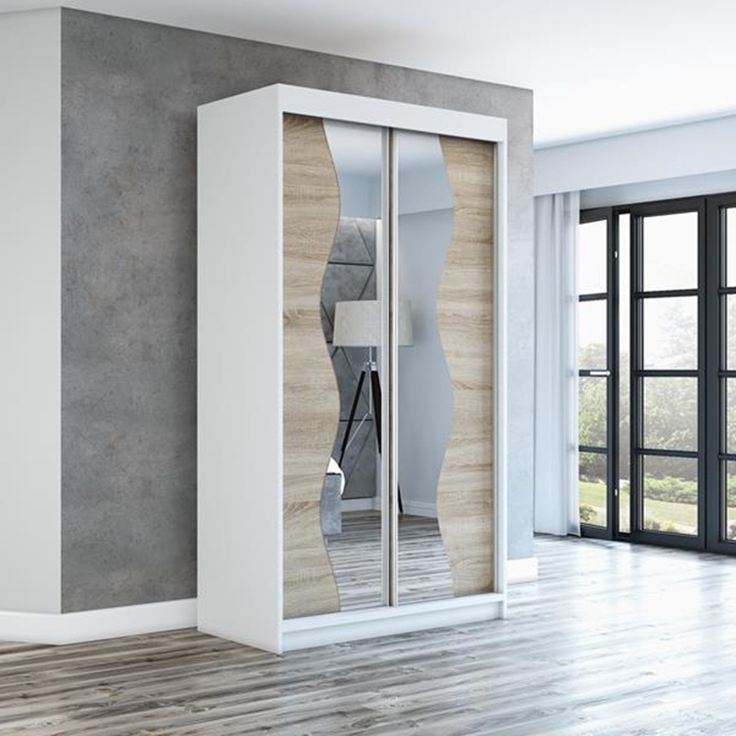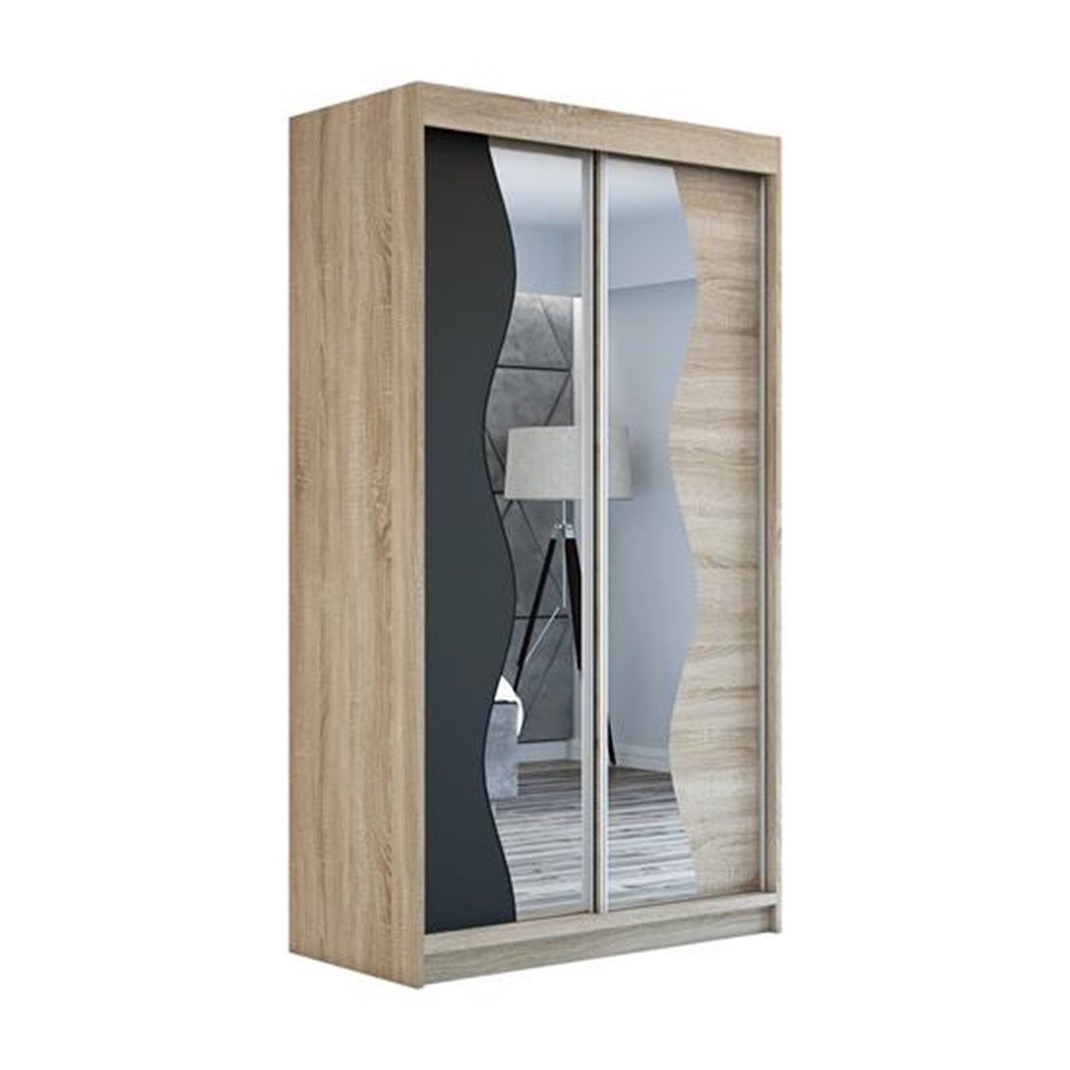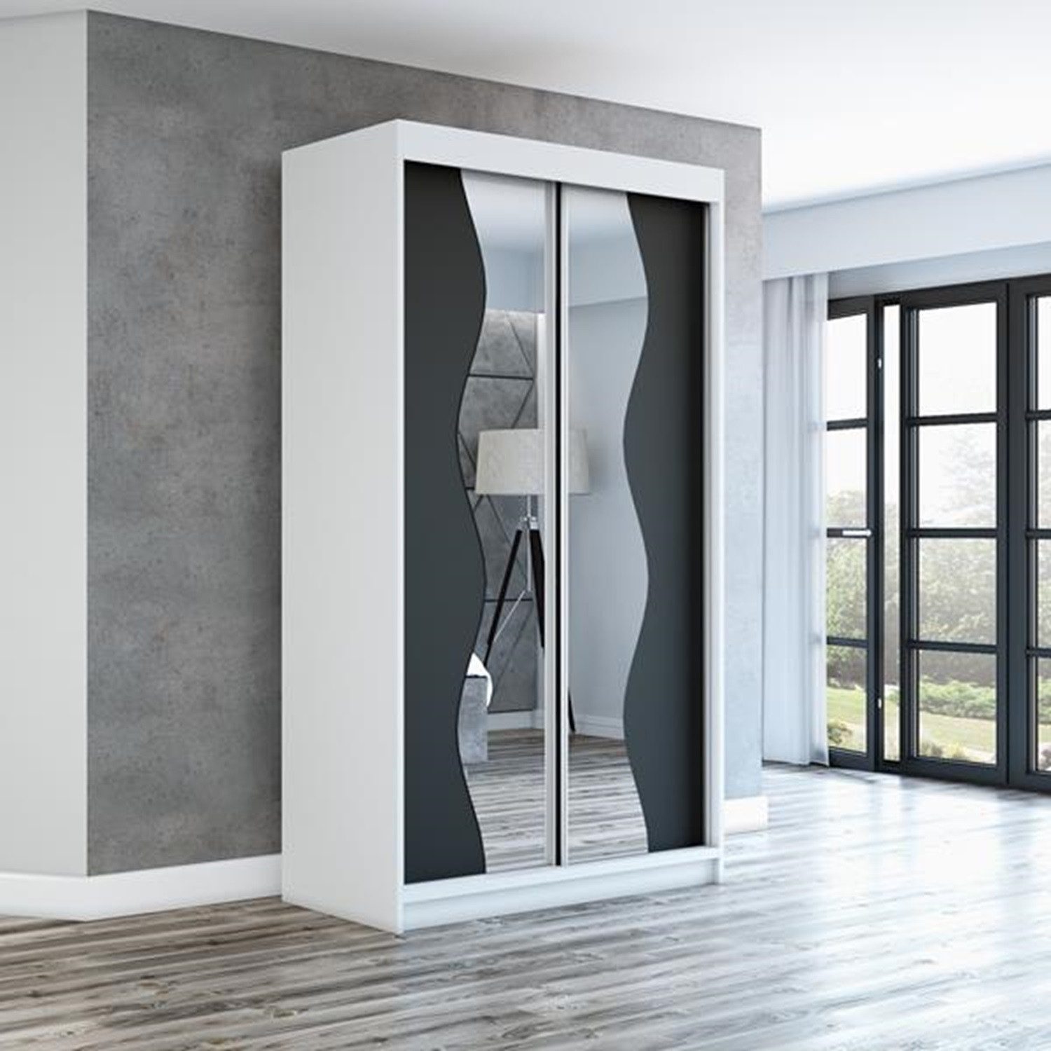 Der moderne 2-türige Kleiderschrank mit zwei Spiegeln ist die ideale Lösung für jedes Zuhause, das elegantes Design mit praktischer Funktionalität kombiniert. Der Schrank ist in drei verschiedenen Größen erhältlich (120 cm, 160 cm, 180 cm), sodass Sie das Modell auswählen können, das perfekt in Ihr Zimmer passt. Mit einer praktischen Kleiderstange und sechs Regalen bietet der Schrank ausreichend Platz für Ihre Kleidung und Accessoires. Die beiden Spiegel sorgen für praktische und stilvolle Ergänzungen, die den Raum optisch vergrößern.