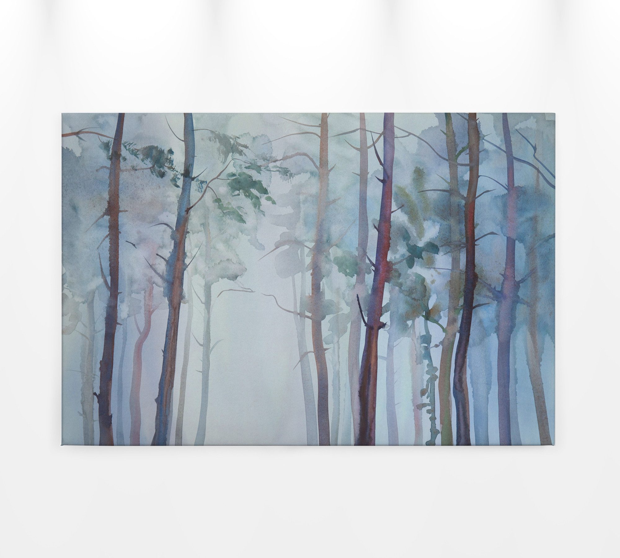 Dieses ätherische Leinwandbild, präsentiert in Aquarelltechnik, entführt den Betrachter in einen nebelverhangenen Wald. Mysteriöse, in Blautönen gehaltene Bäume stehen im Vordergrund, umgeben von sanften Grau- und Grünnuancen, die das Spiel von Licht und Schatten im Wald einfangen. Die braunen Farbtupfer der Baumstämme verleihen dem Bild eine natürliche Wärme, während weiße Freiräume die Illusion von Nebelschwaden verstärken. Dieses Kunstwerk ist ideal für Liebhaber der Natur und sorgt für eine beruhigende Atmosphäre in jedem Raum.