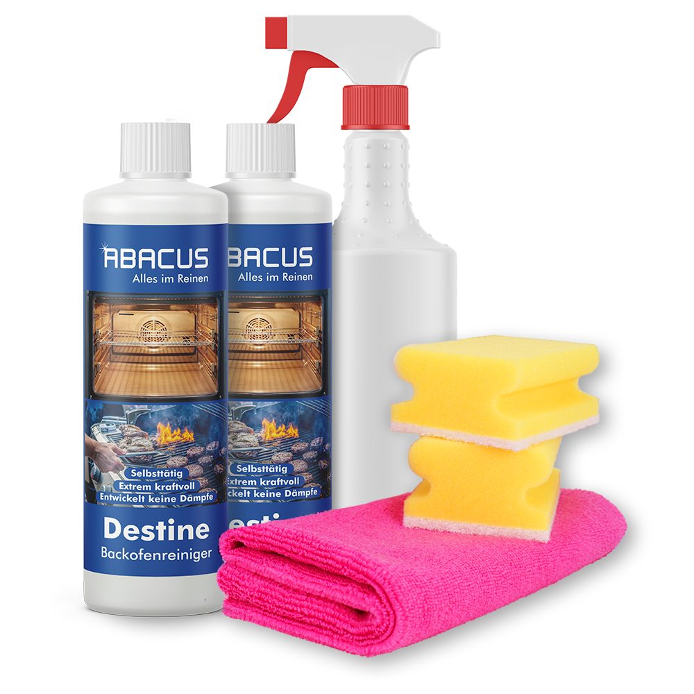 Lieferumfang | 2x500ml Backofenreiniger Gel 1x Handsprühflasche 750ml 1x Sprühkopf Standard Lang 1x Mikrofasertuch High Performance Pink 2x Haushaltsschwamm |