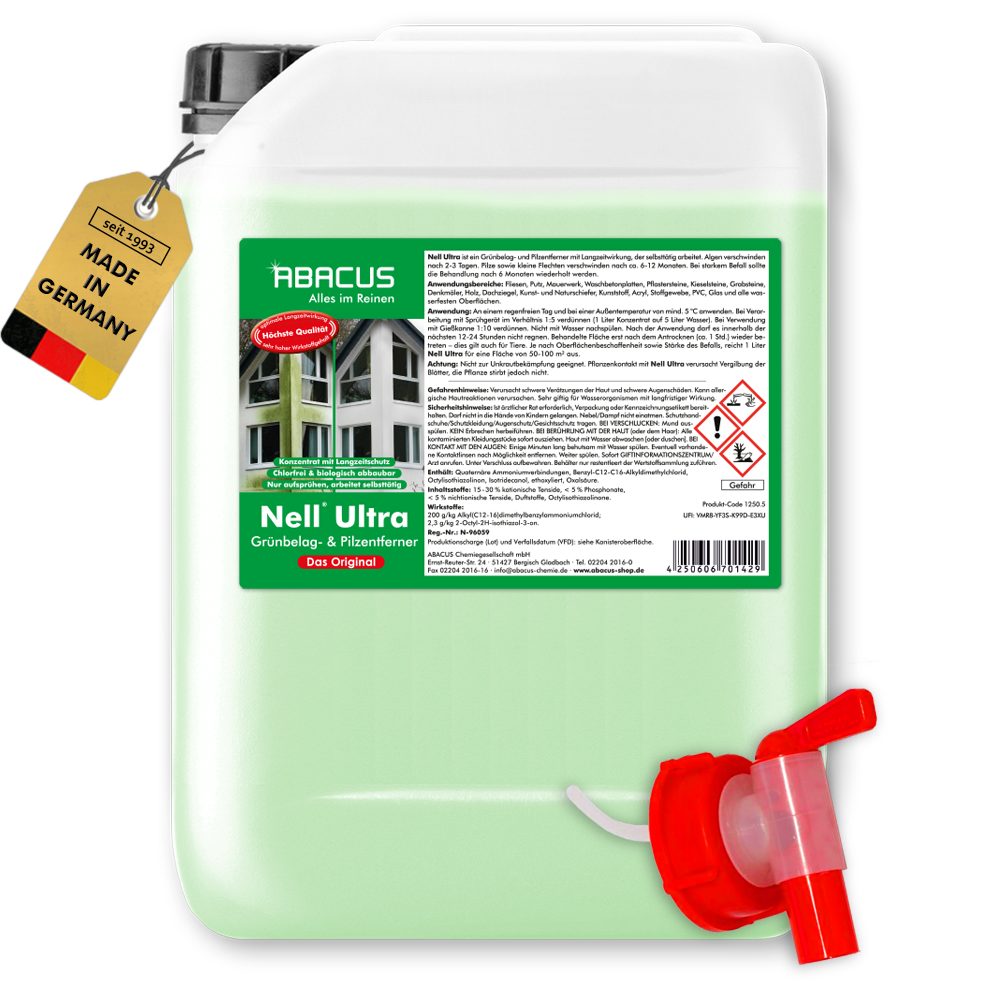 Unser Bestseller! Der Nell Ultra Grünbelagentferner befreit Oberflächen selbsttätig von Grünbelag, Algen, Pilzen und leichtem Flechtenbefall. Kein Schrubben, Abspülen oder Nachbehandeln notwendig.