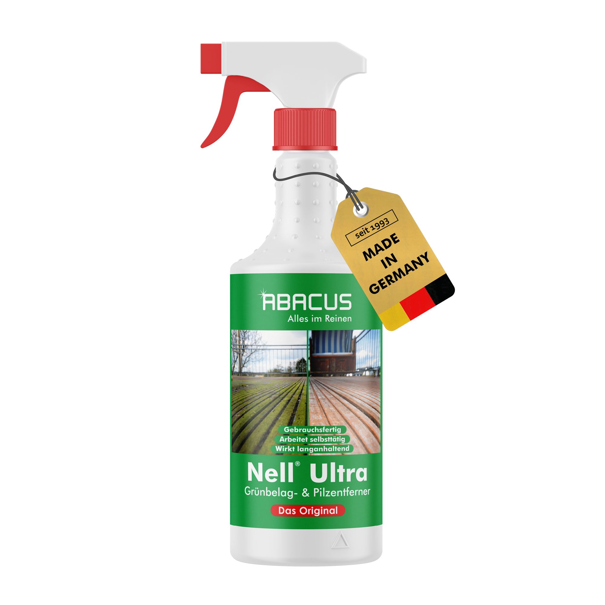 Nell Ultra entfernt Grünbelag, Algen, Pilze und Flechten von Terrassenplatten, Holzterrassen, Zäunen, Markisen, Dachziegel, Balkonen, Kunststoffdächern, Wohnmobilen, Gartenmöbel, Booten, Grabsteinen und vielem mehr.