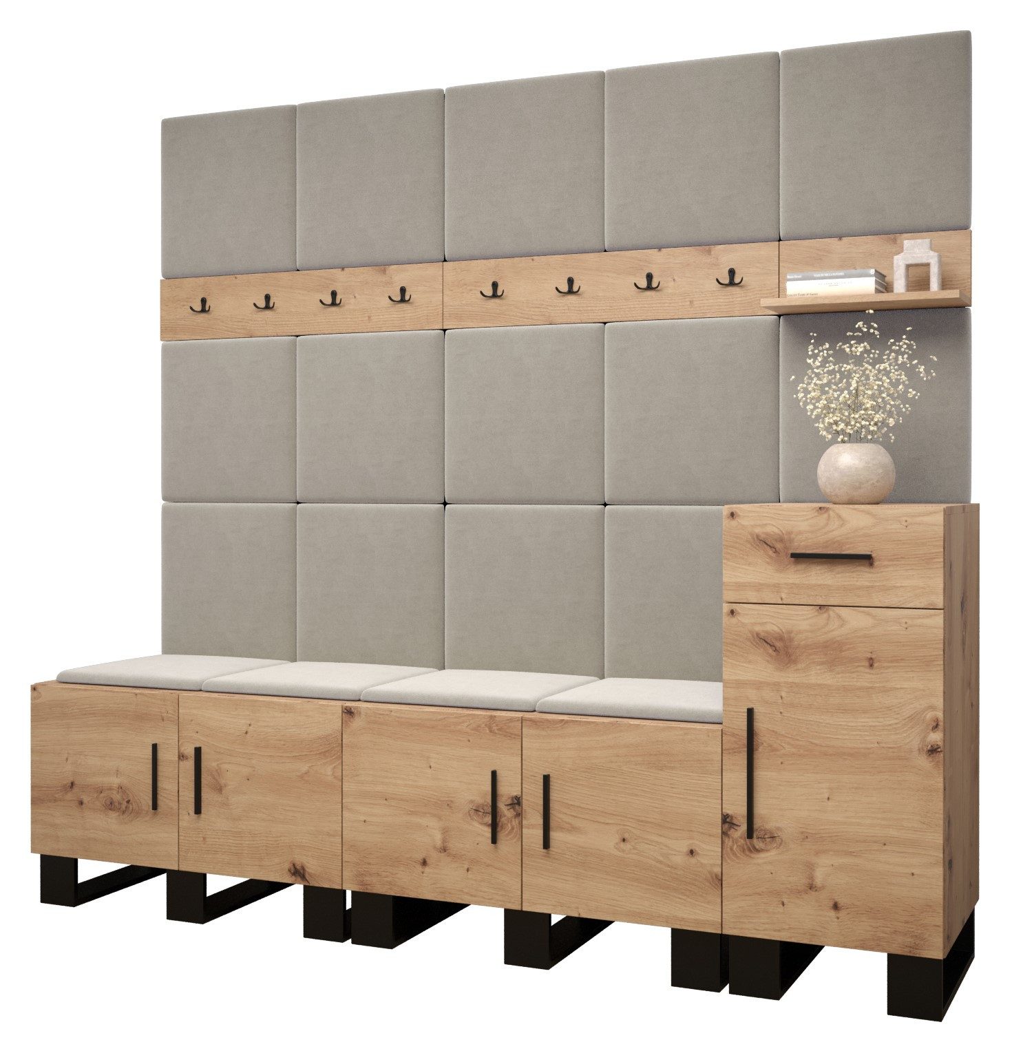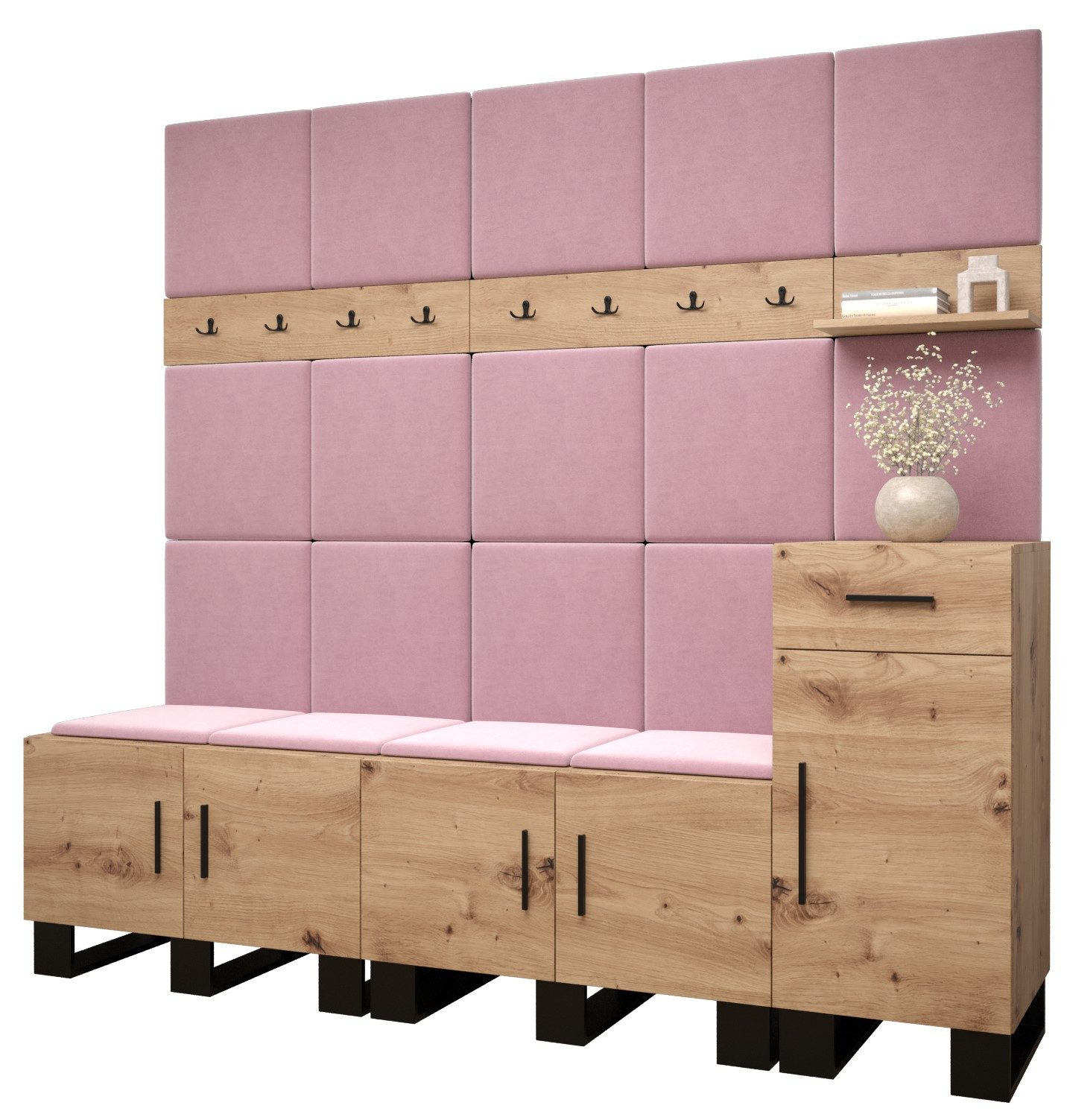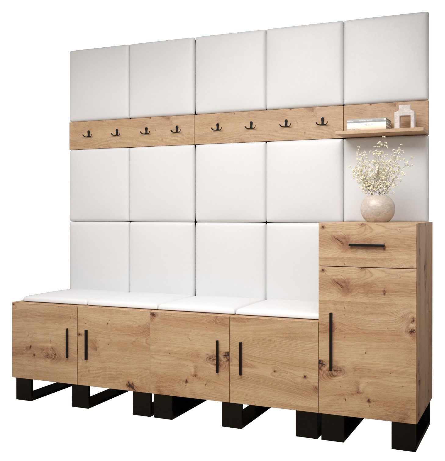 Viel Platz: Der ARTIN-Garderobe ist ein Möbelstück im modernen Stil mit modischen Polsterpaneelen, eine große Anzahl von Regalen und Kleiderbügeln verleihen dem Kleiderschrank außergewöhnliche Funktionalität. Elegantes Design und eine große Auswahl an Paneelfarben ermöglichen es Ihnen, die Garderobe in Ihrem Flur frei zu gestalten!